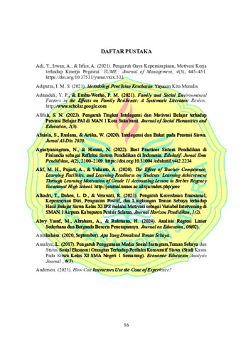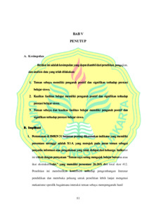 ABSTRAK Hana Haisunasya, 1709620005. Pengaruh Teman Sebaya dan Kualitas Fasilitas Belajar terhadap Prestasi Belajar Siswa SMKN 31 Jakarta.Skripsi Jakarta: Program Studi S1 Pendidikan Administrasi Perkantoran, Fakultas Ekonomi, Universitas Negeri Jakarta, Juli 2024. Penelitian ini mengkaji prestasi siswa di SMK Negeri 31 Jakarta dengan fokus pada aspek kognitif, afektif, dan psikomotorik, yang bertujuan untuk mengevaluasi prestasi siswa dan mengidentifikasi faktor-faktor yang memengaruhi, seperti teman sebaya dan kualitas fasilitas belajar. Menggunakan pendekatan kuantitatif dengan sampel jenuh sebanyak 108 siswa kelas X Manajemen Perkantoran dan Layanan Bisnis (MPLB), XI MPLB, dan X Bisnis Ritel (BR), data dikumpulkan melalui kuesioner dan dianalisis menggunakan Statistical Package for the Social Sciences (SPSS) versi 29. Analisis melibatkan regresi linier, uji prasyarat statistik, dan pengujian hipotesis, termasuk uji-t, uji-f, dan R-square untuk mengevaluasi hubungan antar variabel. Hasil menunjukkan bahwa faktor teman sebaya dan kualitas fasilitas belajar berdampak signifikan terhadap prestasi siswa. Rekomendasi termasuk meningkatkan kegiatan kolaboratif dan meningkatkan fasilitas. Penelitian masa depan harus mengeksplorasi variabel dan metode tambahan seperti observasi atau wawancara untuk wawasan yang lebih komprehensif. Kata Kunci: Teman Sebaya, Kualitas Fasilitas Belajar, Prestasi Belajar, Interaksi Sosial, Aspek Kognitif
