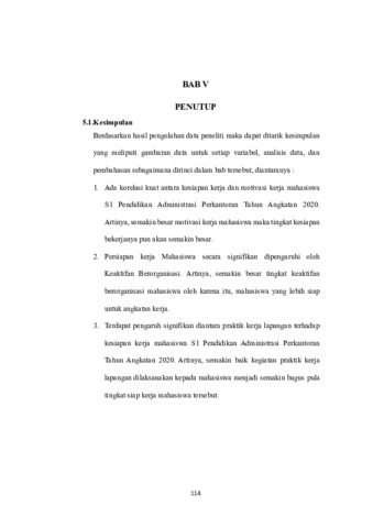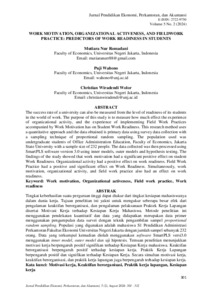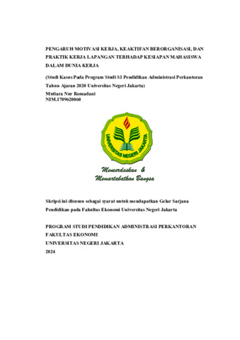 ABSTRAK MUTIARA NUR ROMADANI, 1709620060. “Pengaruh Motivasi Kerja, Keaktifan Berorganisasi, dan Praktik Kerja Lapangan terhadap Kesiapan Mahasiswa dalam Dunia Kerja (Studi Kasus Pada Program Studi S1 Pendidikan Administrasi Perkantoran Tahun Ajaran 2020 Universitas Negeri Jakarta)”. Skripsi. Pendidikan Administrasi Perkantoran. Fakultas Ekonomi. Universitas Negeri Jakarta. 2024 Tingkat keberhasilan sebuah perguruan tinggi dapat diukur juga dari tingkat kesiapan mahasiswanya dalam bekerja. Kesiapan mahasiswa dalam bekerja dapat diukur melalui motivasinya dalam bekerja, dan skill yang dimilikinya dari pengalaman saat di dunia kampus. Maka dari itu penelitian ini bertujuan untuk meneliti tentang seberapa besar pengaruh pengalaman Keaktifan Berorganisasi, dan pengalaman pelaksanaan Praktik Kerja Lapangan yang disertai dengan Motivasi untuk Bekerja terhadap Kesiapan Mahasiswa dalam Bekerja. Populasi penelitian ini adalah sebanyak 339 Mahasiswa yang kemudian dihitung menggunakan rumus slovin sehingga menghasilkan sampel sejumlah 232. Metode penelitian yang digunakan dalam penelitian ini adalah metode Kuantitatif dan data diperoleh merupakan data primer melalui pengumpulan data survey dengan teknik sampling yang dipilih adalah Proportional Random Sampling. Data yang terkumpul kemudian diolah menggunakan software SmartPLS versi 3.0 dengan menggunakan uji inner model, outer model, dan pengujian hipotesis. Hasil statistik menunjukkan bahwa semua variabel berpengaruh positif dan signifikan secara parsial maupun secara simultan. Hasil dari penelitian ini menyimpulkan motivasi kerja dalam mahasiswa dapat ditingkatkan dan keaktifan berorganisasi serta praktik kerja lapangan dapat membantu dalam meningkatkan kesiapan kerja. Kata Kunci : Motivasi Kerja, Keaktifan Berorganisasi, Praktik Kerja Lapangan, Kesiapan Kerja