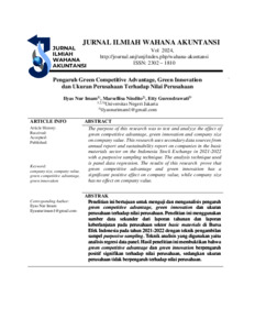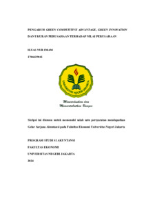 ABSTRAK ILYAS NUR IMAM. Pengaruh Green Competitive Advantage, Green Innovation dan Ukuran Perusahaan Terhadap Nilai Perusahaan. Fakultas Ekonomi, Universitas Negeri Jakarta. 2024. Tujuan dari penelitian ini adalah untuk menguji dan menganalisis Green Competitive Advantage, Green Innovation dan Ukuran Perusahaan Terhadap Nilai Perusahaan. Penelitian ini menggunakan sumber data sekunder yang berasal dari laporan tahunan perusahaan dan laporan keberlanjutan pada perusahaan sektor basic materials yang terdaftar di Bursa Efek Indonesia (BEI) pada tahun 2021-2022 dengan teknik pengambilan sampel purposive sampling. Didapatkan total sampel akhir sebanyak 64 perusahaan, sehingga total data observasi selama tahun 2021- 2022 sebanyak 128 data. Adapun teknik analisis yang digunakan yaitu analisis regresi data panel dengan menggunakan software Econometric Views 13 (EViews). Hasil penelitian ini membuktikan bahwa green competitive advantage dan green innovation berpengaruh positif signifikan terhadap nilai perusahaan, sedangkan ukuran perusahaan tidak berpengaruh terhadap nilai perusahaan. Perusahaan yang mempunyai proses produksi dan produk yang mendukung inovasi hijau akan meningkatkan nilai perusahaan. Maka penelitian ini membuktikan dan memberikan informasi bagi pihak manajemen perusahaan serta masyarakat bahwa terdapat banyak faktor yang dapat mempengaruhi peningkatan nilai perusahaan. Kata kunci: nilai perusahaan, green competitive advantage, green innovation, ukuran perusahaan.