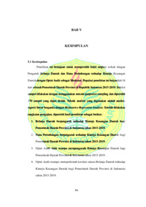 ABSTRAK Luthfiani Fadhila, 2024: Pengaruh Belanja Daerah dan Dana Perimbangan terhadap Kinerja Keuangan Daerah dengan Opini Audit sebagai Moderasi. Penelitian ini dilakukan untuk mengetahui dan menganalisis bagaimana pengaruh Belanja Daerah dan Dana Perimbangan terhadap Kinerja Keuangan Daerah. Pada penelitian ini sumber data yang digunakan adalah data sekunder, yang bersumber dari laporan realisasi anggaran. Unit analisis pada penelitian ini adalah instansi Pemerintah Provinsi yang telah mendapatkan opini audit 2015-2019. Dengan teknik pengambilan sampel yang digunakan dalam penelitian ini adalah purposive sampling yang menghasilkan 34 provinsi dengan total observasi sebanyak 170 sampel. Teknik analisis data pada penelitian ini adalah Moderated Regression Analyis dengan alat analisis menggunakan SPSS 27. Hasil peneltian menunjukkan bahwa Belanja Daerah dan Dana Perimbangan berpengaruh signifikan sementara Opini Audit berhasil memoderasi Belanja Daerah dan Dana Perimbangan terhadap Kinerja. Namun ketika diregresikan secara mandiri Opini Audit tidak berpengaruh terhadap Kinerja. Kata kunci: Belanja Daerah, Dana Perimbangan, Opini Audit, Kinerja Keuangan Daerah