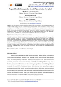 ABSTRAK MERDHANIA KHUSUMANINGRUM. Pengaruh kondisi keuangan dan kondisi perpajakan terhadap Cost of Debt. Fakultas Ekonomi Universitas Negeri Jakarta, 2024. Penelitian ini dilakukan bertujuan untuk menguji dan menganalisis pengaruh kondisi keuangan dan kondisi perpajakan terhadap cost of debt. Kondisi keuangan dalam penelitian ini adalah ukuran perusahaan, struktur modal, dan profitabilitas. Sedangkan kondisi perpajak dalam penelitian ini adalah tax avoidance dan risiko pajak. Penelitian ini merupakan penelitian kuantitatif menggunakan data sekunder yang didapatkan dari laporan keuangan perusahaan. Populasi dalam penelitian ini adalah perusahaan industri Hotel, Restoran, dan Pariwisata periode 2018-2022 yang diseleksi menggunakan metode purposive sampling dan uji outlier dan diperoleh sampel sebanyak 114. Teknik analisis yang digunakan dalam penelitian ini adalah analisis regresi data panel yang diolah menggunakan EViews versi 13. Hasil penelitian ini menunjukkan bahwa struktur modal dan profitabilitas berpengaruh terhadap cost of debt. Sedangkan ukuran perusahaan, tax avoidance, dan risiko pajak tidak berpengaruh terhadap cost of debt. Hasil penelitian ini mengimplikasikan walaupun perusahaan besar cenderung menggunakan utang yang besar, namun beberapa perusahaan lebih memilih untuk menggunakan dana internal sebagai sumber pembiayaan. Hasil penelitian ini juga dapat mendukung grand theory yang dijadikan dasar dalam pengembangan hipotesis pada penelitian ini, yaitu trade-off theory. Kata Kunci: Cost of debt, Ukuran Perusahaan, Struktur Modal, Profitabilitas, Tax Avoidance, Risiko Pajak
