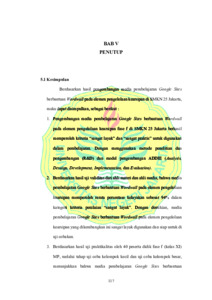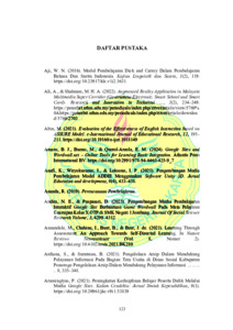 PENGEMBANGAN MEDIA PEMBELAJARAN GOOGLE SITES BERBANTUAN WORDWALL PADA ELEMEN PENGELOLAAN KEARSIPAN DI SMKN 25 JAKARTA ABSTRAK Suwantini 1709620007 Universitas Negeri Jakarta Seiring dengan kemajuan teknologi digital dalam era globalisasi dan Revolusi Industri 4.0, serta didukung oleh Kurikulum Merdeka yang meningkatkan kualitas pendidikan melalui pendekatan intrakurikuler yang bervariasi dan pembelajaran berdiferensiasi, guru diharapkan untuk melakukan inovasi pembelajaran berbasis digital. Penelitian ini bertujuan untuk : (1) mengembangkan media pembelajaran Google Sites berbantuan Wordwall pada elemen pengelolaan kearsipan; (2) menganalisis tingkat kelayakan media pembelajaran Google Sites berbantuan Wordwall pada elemen pengelolaan kearsipan; ; (3) mengetahui tingkat praktikalitas media pembelajaran Google Sites berbantuan Wordwall pada Elemen Pengelolaan Kearsipan. Jenis penelitian yang digunakan adalah Penelitian dan Pengembangan (R&D). Kemudian model desain pengembangan yang digunakan pada penelitian ini adalah model ADDIE, yang terdiri dari lima tahapan, yaitu Analysis, Design, Development, Implementation, dan Evaluation. Subjek pada penelitian adalah peserta didik kelas XI Manajemen Perkantoran dengan jumlah sebanyak 40 siswa. Ukuran sampel pada penelitian ini sebanyak 10 peserta didik yang ditentukan dengan metode acak. Teknik pengumpulan data pada penelitian ini adalah angket/kusioner. Analisis data dilakukan dengan analisis deskriptif kualitatif dan kuantitatif. Kelayakan media pembelajaran dinilai oleh ahli media dan ahli materi. Berdasarkan penelitian yang dilakukan memperoleh hasil : (1) media pembelajaran media pembelajaran Google Sites berbantuan Wordwall pada elemen pengelolaan kearsipan berhasil dikembangkan; (2) hasil validasi ahli diketahui bahwa media pembelajaran Google Sites berbantuan Wordwall pada elemen pengelolaan kearsipan sangat layak untuk digunakan dengan memperoleh hasil rerata kelayakan dari ahli materi sebesar 96% dengan kategori “sangat layak” dan ahli media sebesar 92% dengan kategori “sangat layak”; (3) hasil uji praktikalitas dengan melalui dua tahapan, yaitu uji coba kelompok kecil mencapai persentase kepraktisan sebesar 91% dengan kategori “sangat praktis” dan uji kelompok besar mencapai persentase 95% dengan kategori “sangat praktis”. Dengan demikian, hasil penelitian menunjukkan bahwa pengembangan Media Pembelajaran Google Sites Berbantuan Wordwall Pada Elemen Pengelolaan Kearsipan sangat layak dan sangat praktis untuk digunakan dalam kegiatan pembelajaran. Kata Kunci : Pembelajaran, Google Sites, Wordwall, dan Elemen Pengelolaan Kearsipan