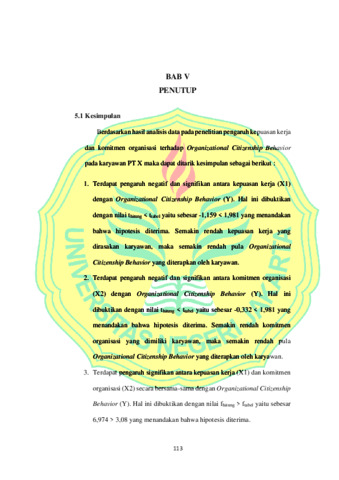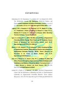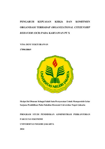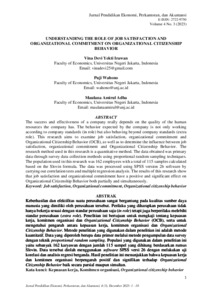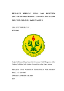 ABSTRAK Vina Devi Yekti Irawan, 2024 : Pengaruh Kepuasan Kerja dan Komitmen Organisasi terhadap Organizational Citizenship Behavior (OCB) pada Karyawan PT X. Skripsi. Jakarta: Program Studi S1 Pendidikan Administrasi Perkantoran, Fakultas Ekonomi, Universitas Negeri Jakarta. Januari 2024 Sumber daya manusia merupakan hal yang sangat penting dalam perusahaan karena keberhasilan dan efektivitas suatu perusahaan sangat bergantung pada kualitas sumber daya manusia yang dimiliki oleh perusahaan tersebut. Tujuan perusahaan tidak dapat tercapai tanpa peranan dari sumber daya manusianya. Perilaku yang diharapkan perusahaan tidak hanya bekerja sesuai dengan standar perusahaan saja (in role) tetapi juga berperilaku melebihi standar perusahaan (extra role). Perilaku extra role ini disebut juga dengan istilah Organizational Citizenship Behavior (OCB). Penelitian ini bertujuan untuk mengkaji tentang kepuasan kerja, komitmen organisasi dan Organizational Citizenship Behavior (OCB), serta untuk mengetahui pengaruh antara kepuasan kerja, komitmen organisasi dan Organizational Citizenship Behavior (OCB). Metode penelitian yang digunakan dalam penelitian ini adalah metode kuantitatif. Data yang diperoleh berupa data primer melalui metode pengumpulan data survey dengan teknik proportional random sampling. Populasi yang digunakan dalam penelitian ini yaitu sebanyak 162 karyawan dengan jumlah 115 sampel yang dihitung berdasarkan rumus Slovin. Data tersebut diolah menggunakan software SPSS versi 26 dengan melakukan uji korelasi dan analisis regresi berganda. Hasil penelitian ini menunjukkan bahwa kepuasan kerja dan komitmen organisasi berpengaruh negatif dan signifikan terhadap Organizational Citizenship Behavior (OCB). Kata Kunci: Kepuasan Kerja, Komitmen Organisasi, Organizational Citizenship Behavior (OCB)