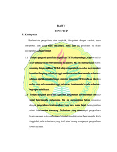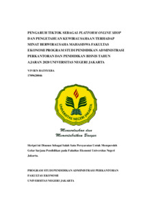 ABSTRAK VIVIEN BATSYEBA, 1709620046, Pengaruh TikTok Sebagai Online shop dan Pengetahuan Kewirausahaan terhadap Minat Berwirausaha Mahasiswa Fakultas Ekonomi Universitas Negeri Jakarta. Skripsi, Jakarta: Fakultas Ekonomi. 2024. Tujuan dari penelitian ini adalah mengetahui dan menganalisis pengaruh Tiktok sebagai platform online shop dan pengetahuan kewirausahaan terhadap minat berwirausaha Mahasiswa Fakultas Ekonomi Universitas Negeri Jakarta. Temuan penelitian ini mendukung hipotesis yang menunjukkan hasil uji t (parsial) Tiktok sebagai platform online shop (X1) berpengaruh positif dan signifikan terhadap minat berwirausaha mahasiswa (Y), penelitian ini menggunakan SPSS (Statistical Package for Social Science), penelitian ini memiliki nilai signifikasi hasil t hitung sebesar 2,651 > t tabel 1,98282, Minat Berwirausaha (Y) selanjutnya dipengaruh secara positif dengan pengetahuan kewirausahaan (X2), dengan nilai thitung sebesar 3,009 > ttabel 1,98282. Untuk hasil uji f (Simultan) diperoleh kesimpulan Fhitung 9,568 > Ftabel 3,08. Dengan koefisien determinasi (R2) sebesar R2=0,154 maka dapat diketahui bahwa variabel X mempengaruhi variabel Y sebesar 15,4%, dengan tambahan faktor yang tidak dimasukkan dalam model penelitian ini mempengaruhi sisanya sebesar 84,6%. Dari hasil penelitian ini dapat ditarik kesimpulan bahwa mahasiswa Pendidikan Administrasi Perkantoran dan Pendidikan Bisnis Tahun 2020 Fakultas Ekonomi tertarik untuk berwirausaha baik karena dampak dari pengetahuan kewirausahaan maupun penggunaan aplikasi Tiktok. Kata Kunci: Tiktok Sebagai Platform Online Shop, Pengetahuan Kewirausahaan, Minat Berwirausaha