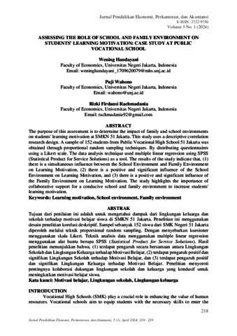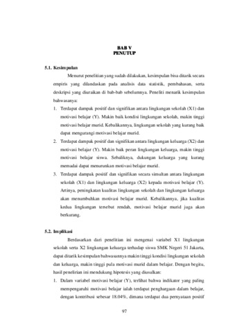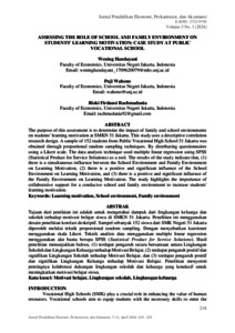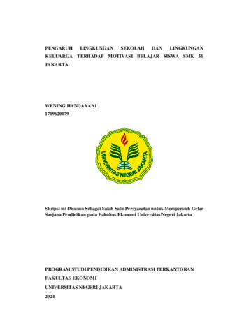 ABSTRAK Wening Handayani, 1709620079. Pengaruh Lingkungan Sekolah dan Lingkungan Keluarga Terhadap Motivasi Belajar Siswa SMK Negeri 51 Jakarta. Skripsi, Jakarta: Fakultas Ekonomi, Universitas Negeri Jakarta 2024. Penelitian ini bertujuan untuk mengetahui pengaruh lingkungan sekolah dan lingkungan keluarga terhadap motivasi belajar siswa SMKN 51 Jakarta. Penelitian ini dilakukan mulai dari bulan Oktober 2023 hingga Juni 2024. Metode yang digunakan dalam penelitian ini adalah metode kuantitatif. Jenis penelitian yang digunakan dalam penelitian ini adalah deskriptif korelasional. Teknik pengambilan sampel menggunakan Proportional Random Sampling sehingga memperoleh sampel berjumlah 152 siswa dari SMK Negeri 51 Jakarta. Pengumpulan data dilakukan melalui penyebaran kuesioner dengan menggunakan skala likert. Teknik analisis data menggunakan alat bantu berupa SPSS (Statistical Product for Service Solutions). Hasil penelitian ini menunjukan bahwa uji Hipotesis terdiri dari Uji F, Uji t. Berdasarkan perbandingan Fhitung dan Ftabel menggunakan tabel ANOVA, diperoleh Fhitung sebesar 92.089 > 3.06. Artinya bahwa terdapat pengaruh secara bersamaan antara Lingkungan Sekolah (X1) dan Lingkungan Keluarga (X2) terhadap Motivasi Belajar (Y). Hasil Uji t untuk Lingkungan Sekolah (X1) thitung > ttabel = 3.282 > 1.97601 dan Lingkungan Keluarga (X2) thitung > ttabel = 7.758 > 1.97601. Artinya terdapat pengaruh positif dan signifikan Lingkungan Sekolah (X1) terhadap Motivasi Belajar (Y) dan terdapat pengaruh positif dan signifikan Lingkungan Keluarga (X2) terhadap Motivasi Belajar (Y). Analisis Koefisien Determinasi (R2) dengan hasil sebesar 0.553 yang bermakna 55% berabelitas variabel Motivasi Belajar dapat dijelaskan oleh Lingkungan Sekolah dan Lingkungan Keluarga. Sedangkan sisanya 45% dipengaruhi oleh variabel lain yang tidak diteliti. Kata Kunci : Lingkungan Sekolah, Lingkungan Keluarga, Motivasi Belajar