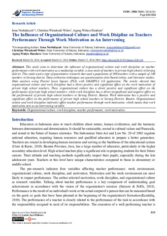 Penelitian ini bertujuan untuk menentukan pengaruh budaya organisasi dan disiplin kerja terhadap kinerja guru dengan motivasi kerja sebagai variabel mediasi. Studi kasus terhadap guru di sekolah menengah atas swasta di Kabupaten Serang, Banten. Penelitian ini menggunakan jenis penelitian kuantitatif yang menggunakan populasi 590 orang dengan sampel sebanyak 160 orang guru di Kabupaten Serang, Banten. Teknik pengumpulan data menggunakan kuesioner yang di sebarkan secara online, dan studi literatur. Analisis data menggunakan Parcial Least Square (PLS) dengan aplikasi SMARPLS 4.0. Hasil penelitian menunjukkan bahwa Budaya organisasi dan disiplin kerja berpengaruh langsung positif dan signifikan terhadap motivasi kerja guru SMA swasta di daerah Kab.Serang, Banten. Lalu, Budaya organisasi berpengaruh langsung positif dan signifikan terhadap kinerja guru SMA swasta di daerah Kab.Serang, Banten, sedangkan Disiplin kerja berpengaruh langsung tidak signifikan dan negative terhadap kinerja guru SMA swasta di daerah Kab.Serang, Banten. Motivasi kerja berpengaruh positif dan signifikan terhadap kinerja guru SMA swasta di daerah Kab.Serang, Banten. Budaya organisasi dan disipin kerja berpengaruh secara tidak langsung terhadap kinerja guru melalui motivasi kerja yang artinya motivasi kerja bertindak sebagai variabel intervening. Kata kunci :budaya organisasi, disiplin kerja, motivasi kerja, kinerja guru