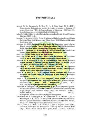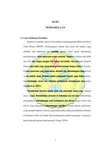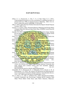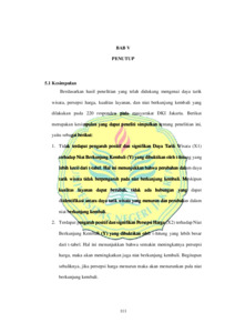 ABSTRAK Dian Ashari. Pengaruh Daya Tarik Wisata, Persepsi Harga, dan Kualitas Layanan terhadap Niat Berkunjung Kembali pada Objek Wisata Dunia Fantasi Ancol (Studi Kasus pada Masyarakat DKI Jakarta). Skripsi, Jakarta: Program Studi Pendidikan Bisnis, Fakultas Ekonomi, Universitas Negeri Jakarta, 2024. Penelitian ini bertujuan untuk menguji pengaruh dari daya tarik wisata, persepsi harga, dan kualitas layanan terhadap niat berkunjung kembali. Metode pengumpulan data menggunakan survei dengan instrumen berupa kuesioner yang disebarkan secara online. Populasi yang digunakan yaitu pengunjung Dufan Ancol dengan kriteria merupakan masyarakat DKI Jakarta; sudah berusia 17 tahun ke atas; dan telah melakukan kunjungan ke Dufan Ancol minimal dua kali dalam satu tahun terakhir. Penelitian ini terdapat sebanyak 220 responden yang terlibat, dan data dianalisis menggunakan SPSS Versi 29 untuk mengelola data dan menganalisis hasil penelitian dengan menggunakan persamaan regresi linear berganda. Hasil dalam penelitian menunjukkan bahwa 1) daya tarik wisata tidak berpengaruh positif dan signifikan terhadap niat berkunjung kembali, 2) persepsi harga berpengaruh positif dan signifikan terhadap niat berkunjung kembali, 3) kualitas layanan berpengaruh positif dan signifikan terhadap niat berkunjung kembali, 4) daya tarik wisata, persepsi harga, dan kualitas layanan berpengaruh secara simultan terhadap niat berkunjung kembali. Kata kunci: Daya tarik wisata, persepsi harga, kualitas layanan, niat berkunjung kembali, Dufan Ancol