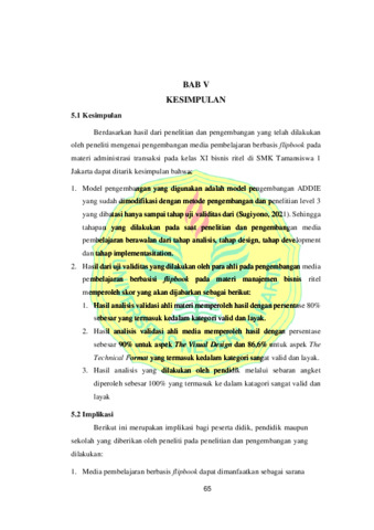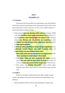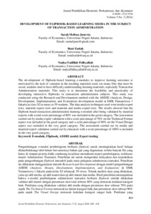 ABSTRAK Penelitian ini untuk mengetahui kelayakan dan kepraktikan pada pengembangan flipbook interaktif pada mata pelajaran administrasi transaksi kelas XI. Penelitian ini dilakukan menggunakan metode Research and Development dengan model pengembangan Analysis, Desain, Development, Implementation, and Evaluation di SMK Tamansiswa 1 Jakarta pada kelas XI sebanyak 59 siswa. Teknik analisis data yang dilakukan, yaitu uji ahli media, uji ahli materi dan uji ahli bahasa. Tetapi penelitian ini memiliki batasan dalam tingkatan (level) penelitian dan pengembangan, yaitu sampai pada level 3. Tingkatan penelitian dan pengembangan hanya sampai level 3, yaitu hanya sampai pada meneliti dan mengembangkan produk yang telah ada. Kata kunci: flibook, ADDIE, Uji Ahli, Batasan pada penelitian dan pengembangan