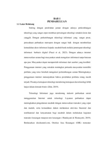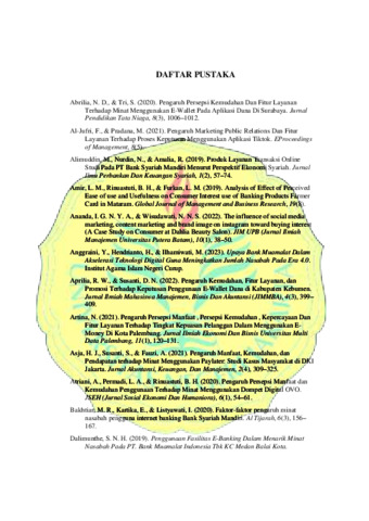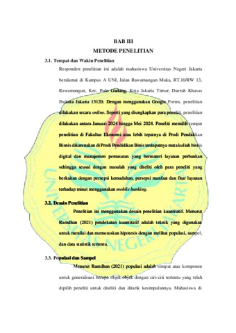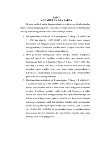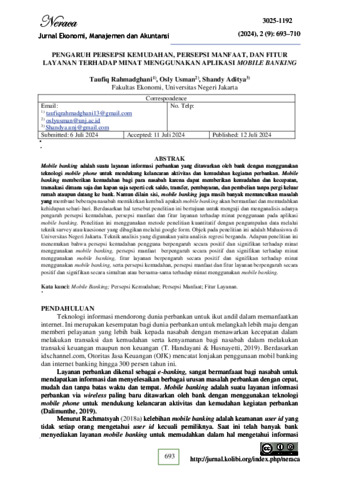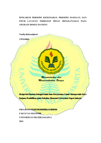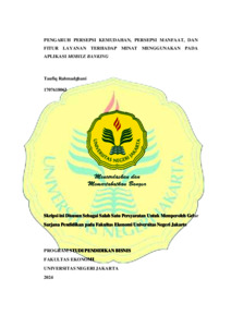 ABSTRAK Taufiq Rahmadghani 1707618063 Pengaruh Persepsi Kemudahan, Persepsi Manfaat, dan Fitur Layanan Terhadap Minat Menggunakan pada Aplikasi Mobile Banking. Mobile banking adalah suatu layanan informasi perbankan yang ditawarkan oleh bank dengan menggunakan teknologi mobile phone untuk mendukung kelancaran aktivitas dan kemudahan kegiatan perbankan. Mobile banking memberikan kemudahan bagi para nasabah karena dapat memberikan kemudahan dan kecepatan, transakasi dimana saja dan kapan saja seperti cek saldo, transfer, pembayaran, dan pembelian tanpa pergi keluar rumah ataupun datang ke bank. Namun dilain sisi, mobile banking juga masih banyak memunculkan masalah yang membuat beberapa nasabah memikirkan kembali apakah mobile banking akan bermanfaat dan memudahkan kehidupan sehari-hari. Berdasarkan hal tersebut penelitian ini bertujuan untuk menguji dan menganalisis adanya pengaruh persepsi kemudahan, persepsi manfaat dan fitur layanan terhadap minat penggunaan pada aplikasi mobile banking. Penelitian ini menggunakan metode penelitian kuantitatif dengan pengumpulan data melalui teknik survey atau kuesioner yang dibagikan melalui google form. Objek pada penelitian ini adalah Mahasiswa di Universitas Negeri Jakarta. Teknik analisis yang digunakan yaitu analisis regresi berganda. Adapun penelitian ini menemukan bahwa persepsi kemudahan pengguna berpengaruh secara positif dan signifikan terhadap minat menggunakan mobile banking, persepsi manfaat berpengaruh secara positif dan signifikan terhadap minat menggunakan mobile banking, fitur layanan berpengaruh secara positif dan signifikan terhadap minat menggunakan mobile banking, serta persepsi kemudahan, persepsi manfaat dan fitur layanan berpengaruh secara positif dan signifikan secara simultan atau bersama-sama terhadap minat menggunakan mobile banking. Kata kunci: Persepsi Kemudahan, Persepsi Manfaat, Fitur Layanan, Minat Menggunakan