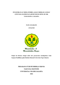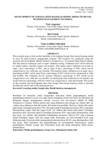 ABSTRAK WATI ANGGRAINI. 1707617059. Pengembangan Media Pembelajaran Berbasis Google Sites pada Materi Manajemen Bisnis Ritel di SMK Tamansiswa Jakarta. Pelaksanaan pendidikan penting untuk dilakukan oleh setiap individu. Pentingnya pendidikan bagi setiap individu harus disertai dengan kualitas pendidikan. Salah satu cara dalam meningkatkan kualitas pendidikan adalah dengan meningkatkan media pembelajaran yang diterapkan di sekolah. Penelitian ini bertujuan guna mendapat kelayakan pada pengembangan media pembelajaran berbasis google sites dalam materi manajemen bisnis ritel kelas XI. Penelitian ini dilakukan dengan menggunakan metode research and development (R&D) di SMK Tamansiswa 1 Jakarta. Model pengembangan yang diterapkan pada penelitian ini adalah model ADDIE. Penggunaan model penelitian pada penelitian ini akan dibatasi hanya mencapai tahap Implementation. Tahap Implementation yang diterapkan adalah dengan melaksanakan uji coba kelompok kecil kepada 10 siswa kelas XI Bisnis Ritel 1. Peneliti juga akan menerapkan tahapan penelitian dan pengembangan level 3 yang dijabarkan oleh Sugiyono (2022), dimana dalam penelitian dan pengembangan level 3 peneliti akan melaksanakan penelitian untuk mengembangkan produk yang telah ada, membuat produk dan menguji validasi produk tersebut. Uji validasi akan dilaksanakan oleh ahli media, ahli materi dan pendidik. Hasil uji validasi ahli media pada tahap I mendapat persentase 94%, dan pada tahap II mendapat persentase 96% yang dapat dikategorikan sangat valid dan sangat layak. Uji validasi ahli materi pada tahap I mendapat persentase 60%, dan pada tahap II mendapat persentase 82% yang dapat dikategorikan valid dan layak. Uji validasi oleh pendidik mendapatkan persentase sebesar 92% yang termasuk dalam kelompok sangat valid dan sangat layak. Kemudian, uji coba kelompok kecil yang dilaksanakan kepada 10 siswa menunjukkan hasil persentase 84.4% yang dikategorikan valid dan layak. Hasil penelitian dan pengembangan ini menunjukkan bahwasannya media pembelajaran berbasis google sites dinyatakan layak dan dapat diterapkan dalam kegiatan belajar mengajar. Kata kunci: Media pembelajaran, Google sites, Manajemen bisnis ritel