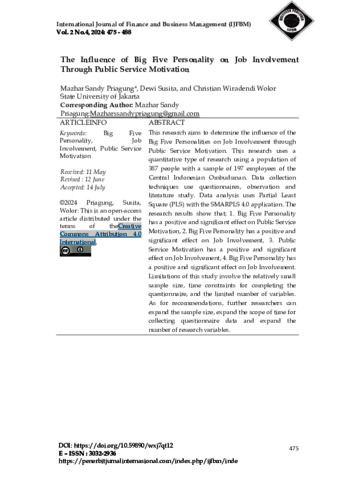 Penelitian ini bertujuan untuk mengetahui Pengaruh Big Five Personality terhadap Job Involvement melalui Public Service Motivation. Penelitian ini menggunakan jenis penelitian kuantitatif dengan menggunakan populasi 387 orang dengan sampel 197 pada pegawai Ombudsman RI Pusat. Teknik pengumpulan data menggunakan kuesioner, observasi dan studi pustaka. Analisis data menggunakan Partial Least Square (PLS) dengan aplikasi SMARTPLS 4.0. Hasil penelitian menunjukan bahwa; 1. Big Five Personality berpengaruh positif dan signifikan terhadap Public Service Motivation, 2. Big Five Personality berpengaruh positif dan signifikan terhadap Job Involvement, 3. Public Service Motivation berpengaruh positif dan signifikan terhadap Job Involvement, 4. Big Five Personality terhadap Job Involvement. Keterbatasan penelitian ini melibatkan ukuran sampel yang relatif kecil, kendala waktu pengisian kuesioner, dan jumlah variabel yang terbatas. Adapun untuk rekomendasi yaitu, peneliti selanjutnya dapat memperluas ukuran sampel, perluasan cakupan waktu pengumpulan data kuesioner serta memperluas jumlah variabel penelitian. Kata kunci: Big Five Personality, Job Involvement, Public Service Motivation.