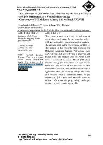 Pekerja pelayaran di Indonesia menghadapi berbagai tantangan, termasuk kondisi kerja yang keras di atas kapal, jauhnya perjalanan yang sering memisahkan mereka dari keluarga, serta risiko keselamatan dan keamanan di laut. Penelitian ini bertujuan untuk menganalisis pengaruh stres kerja dan reward terhadap keselamatan pelayaran dengan kepuasan kerja sebagai variable intervening. Jenis penelitian yang digunakan adalah studi kausal dan metode yang digunakan dalam penelitian ini adalah metode kuantitatif. Populasi dalam penelitian ini adalah alumni Politeknik Ilmu Pelayaran Makassar angkatan XXXVIII yang telah bekerja dibidang pelayaran yang berjumlah 559 orang berdasarkan data lulusan Politeknik Ilmu Pelayaran Makassar. Teknik sampling yang digunakan adalah purposive sampling. Ukuran sampel dalam penelitian ini berjumlah 234 yang ditentukan menggunakan rumus slovin. Dalam penelitian ini, penulis menggunakan metode Partial Least Square Structural Equation Model (PLS-SEM) dengan menggunakan aplikasi SmartPLS 3.0, Hasil penelitian menunjukkan bahwa Stres kerja berpengaruh signifikan terhadap keselamatan pelayaran. Stres kerja berpengaruh terhadap kepuasan kerja. Reward berpengaruh terhadap keselamatan pelayaran. Reward berpengaruh terhadap kepuasan kerja. Kepuasan kerja berpengaruh terhadap keselamatan pelayaran. Stres kerja berpengaruh tidak langsung terhadap keselamatan pelayaran dengan kepuasan kerja sebagai variabel penghubung. Reward berpengaruh tidak langsung terhadap keselamatan pelayaran dengan kepuasan kerja sebagai variabel penghubung. Kata Kunci : Stres Kerja, Reward, Keselamatan Pelayaran, Kepuasan Kerja