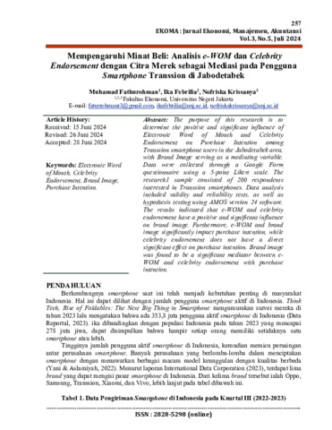 ABSTRAK Muhamad Fathurohman, 1707620018, Pengaruh Electronic Word of Mouth dan Celebrity Endorsement terhadap Purchase Intention melalui Brand Image sebagai variabel Intervening pada pengguna Smartphone di Jabodetabek Penelitian ini bertujuan untuk menentukan pengaruh positif dan signifikan dari Electronic Word of Mouth (e-WOM) dan Celebrity Endorsement terhadap Purchase Intention pada pengguna smartphone Transsion di wilayah Jabodetabek, dengan Brand Image sebagai variabel mediasi. Data dikumpulkan melalui kuesioner Google Form dengan skala Likert 5 poin, yang disebarkan kepada 200 responden yang memenuhi kriteria, yaitu konsumen yang tertarik pada smartphone Transsion. Analisis data dilakukan menggunakan pengujian validitas dan reliabilitas, serta uji hipotesis dengan perangkat lunak AMOS versi 24. Hasil penelitian menunjukkan bahwa e-WOM dan celebrity endorsement memiliki pengaruh positif dan signifikan terhadap brand image. Selain itu, e-WOM dan brand image juga berpengaruh signifikan terhadap minat beli. Namun, berbeda dimana celebrity endorsement tidak memiliki pengaruh langsung yang signifikan terhadap minat beli. Meskipun demikian, brand image terbukti menjadi mediasi yang signifikan antara e-WOM dan celebrity endorsement dengan purchase intention. Ini menunjukkan bahwa meskipun celebrity endorsement tidak langsung mempengaruhi minat beli, pengaruhnya terhadap brand image cukup kuat sehingga secara tidak langsung meningkatkan purchase intention melalui brand image. Oleh karena itu, perusahaan dapat mempertimbangkan untuk fokus pada peningkatan kualitas e-WOM dan pemanfaatan celebrity endorsement yang efektif untuk memperkuat brand image, yang pada akhirnya dapat meningkatkan minat beli konsumen terhadap smartphone Transsion. Temuan ini memberikan wawasan berharga bagi strategi pemasaran, khususnya dalam memanfaatkan media digital dan selebriti untuk membangun dan memperkuat citra merek di pasar yang semakin kompetitif. Kata kunci: Electronic Word of Mouth, Celebrity Endorsement, Brand Image, Purchase Intention