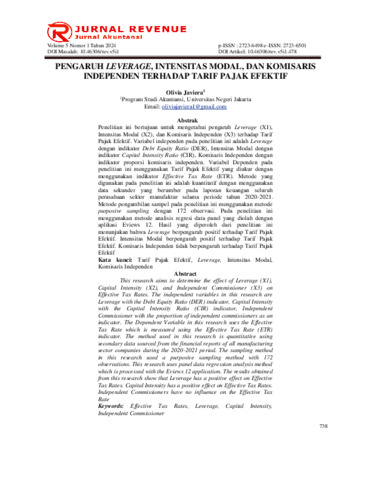 OLIVIA JAVIERA. Pengaruh Leverage, Intensitas Modal dan Komisaris Independen Terhadap Tarif Pajak Efektif. Skripsi. Fakultas Ekonomi. Universitas Negeri Jakarta. 2024. Penelitian ini bertujuan untuk mengetahui pengaruh Leverage (X1), Intensitas Modal (X2), dan Komisaris Independen (X3) terhadap Tarif Pajak Efektif. Variabel independen pada penelitian ini adalah Leverage dengan indikator Debt Equity Ratio (DER), Intensitas Modal dengan indikator Capital Intensity Ratio (CIR), Komisaris Independen dengan indikator proporsi komisaris independen. Variabel Dependen pada penelitian ini menggunakan Tarif Pajak Efektif yang diukur dengan menggunakan indikator Tarif Pajak Efektif (ETR). Metode yang digunakan pada penelitian ini adalah kuantitatif dengan menggunakan data sekunder yang berumber pada laporan keuangan seluruh perusahaan sektor manufaktur selama periode tahun 2020-2021. Metode pengambilan sampel pada penelitian ini menggunakan metode purposive sampling dengan 172 observasi. Pada penelitian ini menggunakan metode analisis regresi data panel yang diolah dengan aplikasi Eviews 12. Hasil yang diperoleh dari penelitian ini menunjukan bahwa Leverage berpengaruh positif terhadap Tarif Pajak Efektif. Intensitas Modal berpengaruh positif terhadap Tarif Pajak Efektif. Komisaris Independen tidak berpengaruh terhadap Tarif Pajak Efektif. Kata kunci: Tarif Pajak Efektif, Leverage, Intensitas Modal, Komisaris Independen
