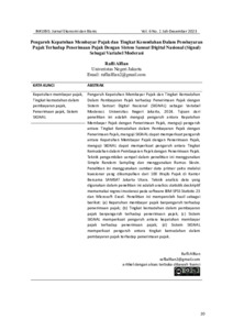 Rafli Alfian. Pengaruh Kepatuhan Membayar Pajak dan Tingkat Kemudahan Dalam Pembayaran Pajak terhadap Penerimaan Pajak dengan Sistem Samsat Digital Nasional (SIGNAL) sebagai Variabel Moderasi. Universitas Negeri Jakarta, 2024. Tujuan dari penelitian ini adalah menguji pengaruh antara Kepatuhan Membayar Pajak dengan Penerimaan Pajak, menguji pengaruh antara Tingkat Kemudahan dalam Pembayaran Pajak dengan Penerimaan Pajak, menguji SIGNAL dapat memperkuat pengaruh antara Kepatuhan Membayar Pajak dengan Penerimaan Pajak, menguji SIGNAL dapat memperkuat pengaruh antara Tingkat Kemudahan dalam Pembayaran Pajak dengan Penerimaan Pajak. Teknik pengambilan sampel dalam penelitian ini menggunakan Simple Random Sampling dan menggunakan Rumus Slovin. Penelitian ini menggunakan sumber data primer yaitu melalui kuesioner yang dikumpulkan dari 100 Wajib Pajak di Kantor Bersama SAMSAT Jakarta Utara. Teknik analisis data yang digunakan dalam penelitian ini adalah analisis statistik deskriptif memamakai regresi moderasi pada software IBM SPSS Statistic 23 dan Microsoft Excel. Penelitian ini memperoleh hasil sebagai berikut: (a) Kepatuhan membayar pajak berpengaruh terhadap penerimaan pajak; (b) Tingkat kemudahan dalam pembayaran pajak berpengaruh terhadap penerimaan pajak; (c) Sistem SIGNAL memperkuat pengaruh antara kepatuhan membayar pajak terhadap penerimaan pajak; (d) Sistem SIGNAL memperkuat pengaruh antara tingkat kemudahan dalam pembayaran pajak terhadap penerimaan pajak. Kata Kunci: Kepatuhan membayar pajak, Tingkat kemudahan dalam pembayaran pajak, Penerimaan pajak, Sistem SIGNAL