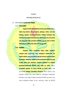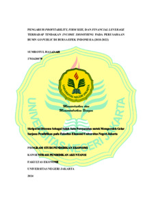SUMROTUL HASANAH. Pengaruh Profitability, Firm Size, dan Financial Leverage Terhadap Tindakan Income Smoothing Pada Perusahaan Bumn Go Public Di Bursa Efek Indonesia (2018-2022). Skripsi. Jakarta. Program Studi Pendidikan Ekonomi Konsentrasi Pendidikan Akuntansi. Fakultas Ekonomi. Universitas Negeri Jakarta. 2024. Penelitian ini bertujuan untuk menguji secara empiris pengaruh secara parsial dan simultan antara variabel independen profitability, firm size, dan financial leverage dengan variabel dependen income smoothing pada perusahaan BUMN Go Public di Bursa Efek Indonesia periode 2018 hingga 2022. Populasi dalam penelitian ini adalah seluruh perusahaan BUMN Go Public yang terdaftar di Bursa Efek Indonesia yang berjumlah 20 perusahaan dengan 5 tahun pengamatan. Metode penelitian yang digunakan adalah metode kuantitatif dengan data sekunder yang berasal dari laporan keuangan perusahaan. Teknik pengambilan sampel yang digunakan yaitu simple random sampling dengan hasil sampel akhir adalah 80 total sampel dari total populasi sebanyak 100 populasi. Teknik analisis data yang digunakan adalah analisis statistik deskriptif, uji asumsi klasik multikolinearitas, uji keseluruhan model, uji kelayakan model, matriks klasifikasi, analisis regresi logistik, dan uji hipotesis. Data diolah dengan bantuan software Eviews versi 12. Penelitian ini menunjukkan hasil sebagai berikut: (1) Secara parsial variabel profitability berpengaruh positif signifikan terhadap income smoothing. (2) Secara parsial variabel firm size berpengaruh negatif signifikan terhadap income smoothing. (3) Secara parsial variabel financial leverage tidak berpengaruh terhadap income smoothing. (3) Secara simultan seluruh variabel independen yaitu profitability, firm size, dan financial leverage terbukti berpengaruh terhadap income smoothing. Temuan penelitian ini menunjukkan bahwa adanya hubungan yang positif antara kenaikan return on asset dengan income smoothing di perusahaan BUMN go public. Kata Kunci : Profitability, Firm Size, Financial Leverage, Income Smoothing, dan Manajemen Laba