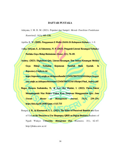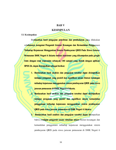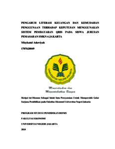 Misykatul Adawiyah, The Influence of Financial Literacy and Ease of Use on the Decision to Use the QRIS Payment System among Marketing Department Students of SMKN 6 Jakarta, Thesis, Faculty of Economics, State University of Jakarta, 2024. Tujuan penelitian ini adalah untuk mengetahui dan menganalisis sejauh mana pengaruh literasi keuangan dan kemudahan penggunaan terhadap keputusan menggunakan. Penelitian ini menggunakan pendekatan kuantitatif dengan metode pengambilan data survei melalui google form. Pernyataan penelitian ini sebelumnya dilakukan uji validitas dan reabilitas kepada 30 orang yang kemudian target pada penelitian ini sebanyak 140 responden yang dihitung melalui rumus slovin. Pengolahan data menggunakan aplikasi statistik SPSS versi 26. Hasil penelitian menunjukan bahwa literasi keuangan berpengaruh secara positif dan signifikan terhadap keputusan menggunakan. Kemudahan penggunaan berpengaruh secara positif dan signifikan terhadap keputusan menggunakan. Literasi keuangan dan kemudahan penggunaan berpengaruh secara simultan terhadap keputusan menggunakan. Kata Kunci: Literasi Keuangan, Kemudahan Penggunaan, Keputusan Menggunakan, QRIS, Siswa
