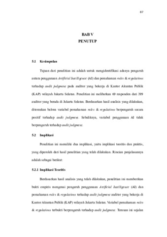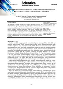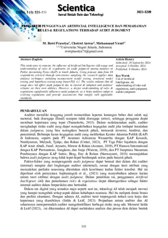 M ROWI PRASETYA. Pengaruh Penggunaan Artificial Intelligence dan Pemahaman Rules & Regulations Terhadap Audit Judgment. Fakultas Ekonomi, Universitas Negeri Jakarta, 2024. Penelitian ini dilakukan untuk mengetahui apakah terdapat pengaruh antara penggunaan Artificial Intelligence (AI) dan pemahaman rules & regulations terhadap audit judgment auditor yang bekerja di Kantor Akuntan Publik wilayah Jakarta Selatan. Penelitian ini menggunakan data primer dengan sampel yaitu auditor yang bekerja pada Kantor Akuntan Publik (KAP) yang berada di wilayah Jakarta Selatan. Teknik pengambilan sampel dalam penelitian ini adalah convenience sampling dengan jumlah responden sebanyak 69 orang. Teknik analisis data yang digunakan dalam penelitian ini adalah uji model pengukuran, uji model struktural, dan uji hipotesis dengan menggunakan software Smart-PLS 4.1. Berdasarkan hasil analisis yang dilakukan, dapat disimpulkan bahwa (1) penggunaan AI tidak memiliki pengaruh terhadap audit judgment. Hal ini dikarenakan adopsi AI yang masih terbatas serta kepercayaan diri auditor terhadap kemampuan dirinya sendiri. (2) Pemahaman rules & regulations memiliki pengaruh positif dan signifikan terhadap audit judgment. Hal ini berarti semakin mendalam pemahaman auditor terhadap rules & regulations, auditor dapat lebih responsif terhadap perubahan aturan yang terus berkembang, sehingga mampu memberikan penilaian yang sesuai dengan rules & regulations yang berlaku. Kata Kunci: Penggunaan Artificial Intelligence, AI, pemahaman rules & regulations, audit judgment, auditor judgment