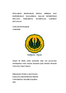 NUR AINI HUMAIRAH. Pengaruh Demografi Dewan Direksi dan Kepemilikan Manajerial Dalam Mendeteksi Peluang Terjadinya Manipulasi Laporan Keuangan. Skripsi. Jakarta: Fakultas Ekonomi dan Bisnis, Universitas Negeri Jakarta, 2025. Penelitian ini memiliki tujuan untuk menguji adanya pengaruh dari demografi dewan direksi yang diproyeksikan oleh demografi chief executive officer dan chief financial officer serta kepemilikan manajerial dalam mendeteksi peluang terjadinya manipulasi atas laporan keuangan. Jenis data yang digunakan adalah data sekunder yang diperoleh dari laman Bursa Efek Indonesia (BEI) dan laman pribadi masingmasing perusahaan. Pengumpulan data menggunakan metode dokumentasi yang diperoleh dari laporan keuangan, laporan tahunan, dan laporan keberlanjutan perusahaan. Populasi yang digunakan dalam penelitian ini adalah perusahaan sektor energi yang terdaftar berturut-turut dalam kurun waktu tahun 2019 – 2023. Dari 54 perusahaan sektor energi yang terdaftar dalam BEI, terdapat 43 perusahaan yang sudah disaring menggunakan metode purposive sampling guna memenuhi kriteria sampel penelitian yang diperlukan. Pengujian data dilakukan menggunakan perangkat SPSS versi 29 dengan analisis yang dipilih pada penelitian ini adalah analisis regresi logistik. Hasil yang ditemukan dalam penelitian yaitu usia dewan direksi yang proyeksikan oleh usia CEO dan usia CFO memiliki pengaruh yang berbeda. Usia CFO memiliki pengaruh yang signifikan dalam mendeteksi peluang terjadinya manipulasi atas laporan keuangan, sedangkan usia CEO tidak memiliki pengaruh yang signifikan dalam mendeteksi peluang terjadinya manipulasi laporan keuangan. Variabel lainnya yaitu gender dewan direksi, latar belakang pendidikan dewan direksi, dan kepemilikan manajerial ditemukan tidak memiliki pengaruh yang signifikan dalam mendeteksi peluang terjadinya manipulasi laporan keuangan. Rekomendasi selanjutnya dari penelitian ini adalah meneliti demografi top management lainnya seperti pengalaman dan masa bekerja top management. Kata kunci: usia dewan direksi, gender dewan direksi, latar belakang pendidikan dewan direksi, kepemilikan manajerial, manipulasi laporan keuangan