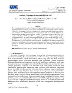 Elsya Safira Hasan. 2025. 1703521047. Analisis Pelayanan Prima pada Klinik Layanan Kesehatan Dewan Perwakilan Rakyat Republik Indonesia (DPR-RI). Program Studi D4 Administrasi Perkantoran Digital, Fakultas Ekonomi dan Bisnis, Universitas Negeri Jakarta. Penelitian ini bertujuan untuk mengetahui bagaimana implementasi pelayanan prima pada Klinik Layanan Kesehatan DPR-RI, mengetahui kendala dalam pelayanan pada Klinik Layanan Kesehatan DPR-RI, dan juga mengetahui rekomendasi solusi dari kendala yang terjadi pada Klinik Layanan Kesehatan DPRRI. Penelitian kualitatif digunakan dalam penelitian ini melalui pendekatan deskriptif yang berfokus pada pengamatan fenomena atau peristiwa dalam kondisi asli. Peneliti menggunakan data primer sebagai pengumpulan data. Data yang dikumpulkan untuk penelitian ini dilakukan secara langsung dari sumber aslinya melalui teknik pengumpulan data observasi, dokumentasi, dan wawancara. Berdasarkan hasil penelitiannya, dapat diketahui bahwa implementasi pelayanan prima pada Klinik Layanan Kesehatan DPR-RI sudah baik. Namun, beberapa dari pasien maupun petugas pelayanan masih merasakan adanya kendala yang terjadi. Kendala tersebut diantaranya adalah kurangnya SDM PNS, petugas yang kurang ramah, dan pemahaman pasien terhadap petugas medis. Dari kendala tersebut terdapat beberapa rekomendasi solusi yaitu membuka lowongan pekerjaan, mengikuti pelatihan yang sudah difasilitasi, dan meningkatkan teknik komunikasi yang baik. Kata Kunci: Pelayanan Prima, Kendala, Rekomendasi Solusi