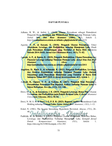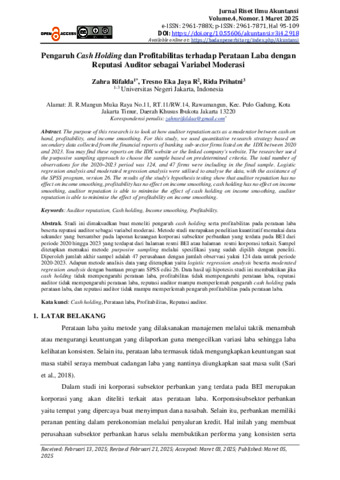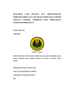 ZAHRA RIFALDA. Pengaruh Cash Holding dan Profitabilitas terhadap Perataan Laba dengan Reputasi Auditor sebagai Variabel Moderasi pada Perusahaan Subsektor Perbankan. Skripsi. Jakarta: Fakultas Ekonomi dan Bisnis, Universitas Negeri Jakarta. 2025. Pada penelitian ini, bentuk dari manajemen laba yang peneliti gunakan yaitu Perataan Laba. Perataan Laba merupakan praktik yang dilakukan manajemen dengan cara menaikkan atau menurunkan laba yang dilaporkan guna mengurangi fluktuasi laba sehingga laba terlihat stabil. Penelitian ini bertujuan untuk menguji Pengaruh Cash Holding dan Profitabilitas terhadap Perataan Laba dengan Reputasi Auditor sebagai Variabel Moderasi. Metode penelitian ini merupakan penelitian kuantitatif dengan menggunakan data sekunder yang berasal dari laporan keuangan Perusahaan Subsektor Perbankan yang terdaftar di Bursa Efek Indonesia (BEI) dari tahun 2020 hingga 2023 yang diperoleh melalui website resmi BEI atau website resmi perusahaan terkait. Sampel dipilih menggunakan teknik purposive sampling dengan kriteria yang telah ditentukan oleh peneliti. Diperoleh jumlah akhir sampel adalah 47 perusahaan dengan jumlah observasi sebanyak 124 data untuk periode 2020-2023. Adapun teknik analisis data yang digunakan merupakan analisis regresi logistik dengan uji interaksi Moderated Regression Analysis menggunakan bantuan program software IBM Statistical Package for Social Science (SPSS) versi 26. Hasil pengujian hipotesis penelitian ini membuktikan bahwa Cash Holding tidak berpengaruh terhadap Perataan Laba, Profitabilitas tidak berpengaruh terhadap Perataan Laba, Reputasi Auditor tidak berpengaruh terhadap Perataan Laba, Reputasi Auditor mampu memperlemah pengaruh Cash Holding terhadap Perataan Laba, dan Reputasi Auditor tidak mampu memperlemah pengaruh Profitabilitas terhadap Perataan Laba. Penelitian selanjutnya diharapkan dapat menggunakan variabel moderasi lain dan memperluas sektor untuk populasi penelitian. Kata kunci: cash holding, profitabilitas, reputasi auditor, perataan laba