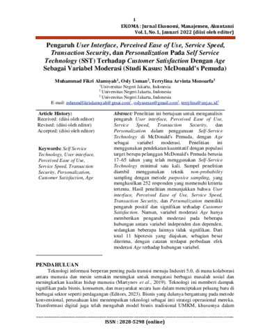 PENGARUH USER INTERFACE, PERCEIVED EASE OF USE, SERVICE SPEED, TRANSACTION SECURITY, DAN PERSONALIZATION PADA SELF SERVICE TECHNOLOGY (SST) TERHADAP CUSTOMER SATISFACTION DENGAN AGE SEBAGAI VARIABEL MODERASI (STUDI KASUS: MCDONALD'S PEMUDA)