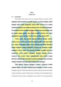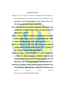 Sabrina Ardianti, 2025; Pengaruh Perceived Price, Product Quality, dan EService Quality Terhadap Consumer Satisfaction Dalam Mempengaruhi Consumer Loyalty Pengguna Online Food Delivery. Skripsi, Jakarta: Program Studi S1 Manajemen, Fakultas Ekonomi dan Bisnis, Universitas Negeri Jakarta, Tim Pembimbing: Prof. Dr. Gatot Nazir Ahmad, M.Si & Nofriska Krissanya, S.E., M.B.A Penelitian ini bertujuan untuk menganalisis pengaruh perceived price, product quality, dan e-service quality terhadap consumer satisfaction dalam mempengaruhi consumer loyalty pengguna layanan online food delivery. Penelitian ini dilakukan dengan pendekatan kuantitatif menggunakan metode Structural Equation Modeling-Partial Least Square (SEM-PLS) untuk mengidentifikasi hubungan antarvariabel. Teknik analisis yang digunakan untuk mengolah data yang terkumpul mencakup uji inner model, uji outer model, dan pengujian hipotesis. Data dikumpulkan melalui survei online terhadap 254 mahasiswa di Jakarta berusia 18- 25 tahun dengan kriteria telah menggunakan layanan OFD minimal tiga kali dalam enam bulan terakhir yang dipilih menggunakan metode non-probability purposive sampling. Instrumen yang digunakan berupa kuesioner berbasis skala Likert 6 poin. Hasil penelitian menunjukkan bahwa perceived price, product quality, dan eservice quality memiliki pengaruh signifikan terhadap consumer satisfaction. Faktor-faktor ini berkontribusi dalam membentuk kepuasan pelanggan melalui perceived price, product quality, serta e-service quality. Di antara ketiga faktor tersebut, product quality ditemukan sebagai determinan utama dalam memengaruhi kepuasan konsumen. Selain itu, consumer satisfaction memiliki hubungan langsung yang kuat dengan consumer loyalty, di mana konsumen yang puas lebih cenderung terus menggunakan layanan OFD yang sama dan merekomendasikannya kepada orang lain. Penelitian ini memberikan kontribusi praktis bagi penyedia layanan OFD dalam meningkatkan kualitas produk, optimalisasi layanan digital, serta penyesuaian harga agar lebih kompetitif guna menarik dan mempertahankan pelanggan. Temuan ini juga dapat menjadi referensi bagi pelaku industri dalam merancang strategi pemasaran yang lebih efektif untuk meningkatkan retensi pelanggan. Secara teoretis, penelitian ini memperkaya literatur terkait perilaku konsumen di era digital, khususnya dalam konteks layanan OFD yang semakin berkembang dan menjadi bagian penting dari gaya hidup modern mahasiswa. Kata kunci: Perceived Price, Product Quality, E-Service Quality, Consumer Satisfaction, Consumer Loyalty.
