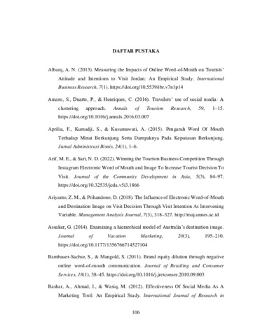 KAMAL, AHMAD FAUZAN (2025) PENGARUH E-WOM, SOCIAL MEDIA MARKETING, ATTRACTIVENESS, DESTINATION IMAGE, DAN VISIT INTENTION TERHADAP VISIT DECISION KE TAMAN NASIONAL GUNUNG GEDE-PANGRANGO. S2 thesis, Universitas Negeri Jakarta.