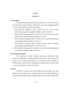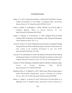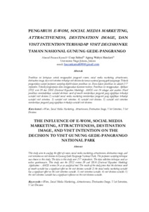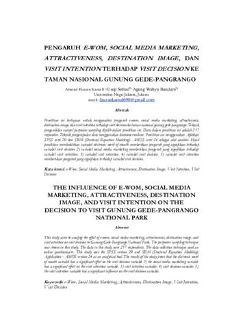 Penelitian ini bertujuan untuk menganalisis pengaruh e-wom, social media marketing, attractiveness, destination image, dan visit intention terhadap visit decision ke taman nasional gunung gede-pangrango. Teknik pengambilan sampel purposive sampling dipilih dalam penelitian ini. Data dalam penelitian ini adalah 217 responden. Teknik pengumpulan data menggunakan kuesioner onliene. Penelitian ini menggunakan Aplikasi SPSS versi 20 dan SEM (Stuctural Equation Modeling)- AMOS versi 24 sebagai alat analisis. Hasil penelitian membuktikan variabel electronic word of mouth memberikan pengaruh yang signifikan terhadap variabel visit decision 2) variabel social media marketing memberikan pengaruh yang signifikan terhadap variabel visit intention. 3) variabel visit intention. 4) variabel visit decision. 5) variabel visit intention memberikan pengaruh yang signifikan terhadap variabel visit decision. Kata kunci: e-Wom, Social Media Marketing, Attractiveness, Destination Image, Visit Intention, Visit Decision