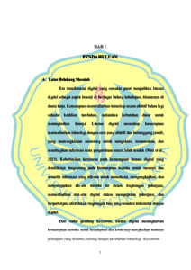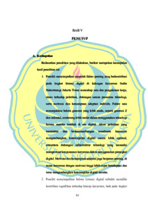 Desti Fadhillah, 2025: Analisis Literasi Digital dalam Upaya Meningkatkan Kinerja pada Karyawan Sudin Nakertransgi Jakarta Timur. Program Studi D4 Administrasi Perkantoran Digital, Fakultas Ekonomi dan Bisnis, Universitas Negeri Jakarta Tujuan penelitian ini adalah mengidentifikasi faktor-faktor yang berperan pada literasi digital karyawan, menganalisis dampaknya pada kinerja individu maupun tim, dan merumuskan strategi pengembangan literasi digital agar berdampak pada peningkatan kinerja karyawan. Penelitian ini menerapkan metode kualitatif deskriptif dengan teknik pengumpulan data melalui wawancara, observasi dan telaah studi pustaka. Populasi penelitian ini adalah lima karyawan di Sudin Nakertransgi Jakarta Timur dengan sampel yang dipilih secara purposive sampling berdasarkan kriteria tertentu untuk mendukung validitas data. Analisis data dilakukan dengan tahapan yang diadaptasi dari model Miles dan Huberman, yang mencakup reduksi data, penyajian data, serta penarikan kesimpulan dan verifikasi. Hasil penelitian menunjukkan bahwa literasi digital di lingkungan kerja Sudin Nakertransgi Jakarta Timur memiliki peran signifikan dalam meningkatkan kinerja karyawan. Namun, terdapat perbedaan adaptasi teknologi antara karyawan muda dan senior, di mana karyawan muda lebih cepat beradaptasi dengan teknologi, sementara karyawan senior mengalami tantangan dalam menguasai teknologi baru. Faktor-faktor literasi digital yang teridentifikasi meliputi usia dan pengalaman, akses pelatihan, sarana prasarana tekonologi dan kemampuan adaptasi. Sebagai strategi, penelitian ini merekomendasikan penyediaan pelatihan berkelanjutan, peningkatan sarana dan prasarana teknologi, serta dukungan instansi untuk menciptakan kinerja yang optimal. Implikasi dari temuan ini adalah perlunya pelatihan literasi digital berkelanjutan untuk meningkatkan adaptasi teknologi karyawan. Literasi digital yang kuat juga mendukung kinerja layanan publik yang lebih responsif, membantu instansi dalam memenuhi kebutuhan masyarakat secara efektif. Kata Kunci: literasi digital, kinerja karyawan, teknologi, pengembangan SDM