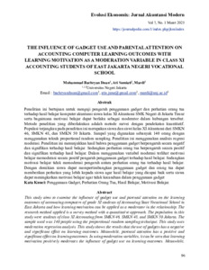 MUHAMMAD BACHRYAN IHSAN. Pengaruh Penggunaan Gadget dan Perhatian Orang Tua Terhadap Hasil Belajar Komputer Akuntansi dengan Motivasi Belajar Sebagai Variabel Moderasi Pada Siswa Kelas XI Akuntansi SMK Negeri Jakarta Timur. Skripsi. Jakarta. Program Studi Pendidikan Ekonomi Konsentrasi Pendidikan Akuntansi. Fakultas Ekonomi dan Bisnis. Universitas Negeri Jakarta. 2025. Penelitian ini bertujuan untuk menguji pengaruh penggunaan gadget dan perhatian orang tua terhadap hasil belajar komputer akuntansi siswa kelas XI Akuntansi SMK Negeri di Jakarta Timur serta bagaimana motivasi belajar dapat berlaku sebagai moderator dalam hubungan tersebut. Metode penelitian yang diberlakukan adalah metode survei dengan pendekatan kuantitatif. Populasi terjangkau pada penelitian ini merupakan siswa dan siswi kelas XI Akuntansi dari SMKN 46, SMKN 48, dan SMKN 50 Jakarta. Sampel yang digunakan sebanyak 140 orang dengan menggunakan teknik proportional random sampling. Penelitian ini menggunakan analisis regresi moderasi. Penelitian ini menunjukkan hasil bahwa penggunaan gadget berpengaruh secara negatif dan signifikan terhadap hasil belajar. Sedangkan perhatian orang tua berpengaruh secara positif dan signifikan terhadap hasil belajar. Dalam menggunakan variabel moderasi terlihat motivasi belajar memoderasi secara positif pengaruh penggunaan gadget terhadap hasil belajar. Sedangkan motivasi belajar tidak memoderasi pengaruh antara perhatian orang tua terhadap hasil belajar. Dengan demikian siswa dapat mempertimbangkan penggunaan gadget dan orang tua dapat memberikan perhatian yang lebih kepada siswa agar hasil belajar yang dicapai baik serta siswa dapat meningkatkan motivasi belajar agar tidak kecanduan dalam penggunaan gadget. Kata kunci: penggunaan gadget, perhatian orang tua, hasil belajar, motivasi belajar