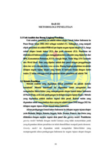 PIPIH HAPIYANI. Analisis Determinan Ekspor Lemak Kakao Indonesia Ke Pasar Eropa Tahun 2002-2023. Skripsi. Jakarta. Program Studi Pendidikan Ekonomi. Fakultas Ekonomi dan Bisnis. Universitas Negeri Jakarta. 2025. Perdagangan internasional dalam perekonomian di Indonesia memiliki tingkat ketergantungan yang signifikan. Terdapat hubungan yang erat antara perdagangan internasional dengan kegiatan ekspor, dengan tujuan agar pendapatan negara meningkat. Dengan adanya komponen ekspor dalam peningkatan perekonomian suatu negara maka negara tersebut akan memiliki potensi yang lebih besar untuk meningkatkan luas pasar baik ditingkat domestik maupun global. Salah satu komoditas ekspor unggulan Indonesia adalah kakao, terutama produk turunannya yaitu lemak kakao. Fokus utama dari penelitian ini adalah untuk mengidentifikasi pengaruh PDB riil per kapita negara tujuan, harga relatif, dan jarak ekonomi terhadap volume ekspor lemak kakao. Metode analisis yang digunakan meliputi analisis regresi dengan alat bantu E-views 12 untuk menguji hubungan antara variabel-variabel tersebut. Hasil penelitian PDB riil per kapita negara tujuan ekspor berpengaruh positif dan signifikan terhadap volume ekspor lemak kakao Indonesia, harga relatif ekspor lemak kakao berpengaruh positif dan signifikan terhadap volume ekspor lemak kakao Indonesia, dan jarak ekonomi berpengaruh negatif dan tidak signifikan terhadap volume ekspor lemak kakao Indonesia ke Pasar Eropa. Kata Kunci: Ekspor, Lemak Kakao, PDB Riil Per Kapita, Harga Relatif Ekspor, Jarak Ekonomi