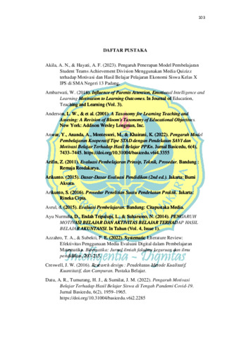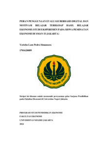 Yericho Lam Pedro Simamora. 2024. 1701620089. Peran Penggunaan Evaluasi Berbasis Digital dan Motivasi Belajar Terhadap Hasil Belajar Ekonomi (Studi Eksperimen Pada Siswa Peminatan Ekonomi di SMAN 53 Jakarta) Tujuan penelitian ini adalah mengetahui perbedaan hasil belajar ekonomi antara kelompok siswa yang diterapkan evaluasi berbasis digital dengan kelompok siswa yang diterapkan evaluasi konvensional, perbedaan hasil belajar ekonomi antara kelompok siswa yang memiliki motivasi belajar tinggi dengan kelompok siswa yang memiliki motivasi belajar rendah, pengaruh interaksi antara evaluasi berbasis digital dan motivasi belajar terhadap hasil belajar ekonomi di SMA Negeri 53 Jakarta. Penelitian ini menggunakan desain quasi-eksperimental, dua kelas dipilih, yaitu satu kelas menggunakan evaluasi berbasis digital melalui platform Quizizz, dan kelas lainnya menggunakan metode evaluasi konvensional. Pengumpulan data melibatkan pretes dan postes, serta kuesioner untuk menilai tingkat motivasi belajar. Hasil uji ANOVA menunjukkan adanya perbedaan signifikan dalam hasil belajar ekonomi antara metode evaluasi berbasis digital dan metode konvensional. Selain itu, terdapat pengaruh interaksi antara metode evaluasi dan tingkat motivasi terhadap hasil belajar, yang menunjukkan bahwa evaluasi digital ditambah motivasi tinggi menghasilkan hasil belajar ekonomi yang optimal. Temuan ini menunjukkan potensi integrasi evaluasi digital untuk meningkatkan hasil belajar dalam pendidikan ekonomi. Kata kunci: evaluasi berbasis digital; hasil belajar ekonomi; motivasi belajar; Quizizz