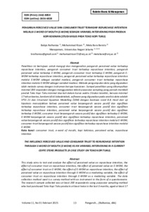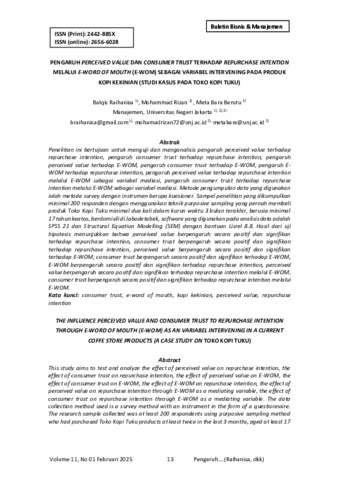Balqis Raihanisa, 2025; Pengaruh Perceived Value dan Consumer Trust Terhadap Repurchase Intention melalui E-Word Of Mouth (E-WOM) Sebagai Variabel Intervening Pada Produk Kopi Kekinian (Studi Kasus Pada Toko Kopi Tuku), Program Studi S1 Manajemen, Fakultas Ekonomi, Universitas Negeri Jakarta, Tim Pembimbing: Prof. Dr. Mohamad Rizan, M.M & Meta Bara Berutu, S.E., M.M. Penelitian ini bertujuan untuk menguji dan menganalisis pengaruh perceived value terhadap repurchase intention, pengaruh consumer trust terhadap repurchase intention, pengaruh perceived value terhadap E-WOM, pengaruh consumer trust terhadap E-WOM, pengaruh E-WOM terhadap repurchase intention, pengaruh perceived value terhadap repurchase intention melalui E-WOM sebagai variabel mediasi, pengaruh consumer trust terhadap repurchase intention melalui E-WOM sebagai variabel mediasi. Metode pengumpulan data yang digunakan ialah metode survey dengan instrument berupa kuesioner. Sampel penelitian yang dikumpulkan minimal 200 responden dengan menggunakan teknik purposive sampling yang pernah membeli produk Toko Kopi Tuku minimal dua kali dalam kurun waktu 3 bulan terakhir, berusia minimal 17 tahun keatas, berdomisili di Jabodetabek, software yang digunakan pada analisis data adalah Structural Equation Modelling (SEM). Hasil dari uji hipotesis menunjukkan bahwa perceived value berpengaruh secara positif dan signifikan terhadap repurchase intention, consumer trust berpengaruh secara positif dan signifikan terhadap repurchase intention, perceived value berpengaruh secara positif dan signifikan terhadap E-WOM, consumer trust berpengaruh secara positif dan signifikan terhadap E-WOM, E-WOM berpengaruh secara positif dan signifikan terhadap repurchase intention, perceived value berpengaruh secara positif dan signifikan terhadap repurchase intention melalui EWOM, consumer trust berpengaruh secara positif dan signifikan terhadap repurchase intention melalui E-WOM. Kata Kunci : Perceived Value, Consumer Trust, Electronic Word of Mouth, Repurchase Intention, Produk Kopi Kekinian