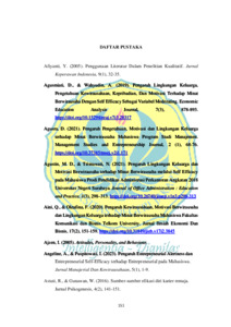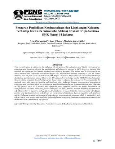 Agnes Sarumpaet, 1707620008. Pengaruh Pendidikan Kewirausahaan dan Lingkungan Keluarga Terhadap Intensi Berwirausaha Melalui Efikasi Diri Pada Siswa SMK Negeri 14 Jakarta. Penelitian ini bertujuan untuk mengetahui pengaruh pendidikan kewirausahaan, lingkungan keluarga terhadap intensi berwirausaha melalui mediasi efikasi diri siswa SMK Negeri 14 Jakarta. Penelitian ini dilakukan selama 4 bulan terhitung dari bulan Agustus hingga November. Metode yang digunakan dalam penelitian ini adalah metode survei. Teknik pemilihan responden menggunakan Proportional Random Sampling sehingga sampel diperoleh berjumlah 140 dari siswa kelas XII SMK Negeri 14 Jakarta. Pengumpulan data dilakukan melalui penyebaran kuesioner denggan menggunakan skala likert. Teknik analisis data yang digunakan yaitu SEM (Structural Equation Model) dengan bantuan program SmartPLS 4. Berdasarkan hasil dan pembahasan dapat ditarik kesimpulan penelitian ini menunjukkan bahwa terdapat pengaruh secara langsung yang positif dan signifikan antara pendidikan kewirausahaan terhadap intensi berwirausaha, terdapat pengaruh secara langsung yang positif dan signifikan antara pendidikan kewirausahaan terhadap efikasi diri, terdapat pengaruh secara langsung yang positif dan signifikan antara lingkungan keluarga terhadap intensi berwirausaha, tidak terdapat pengaruh secara langsung yang positif dan signifikan antara lingkungan keluarga terhadap efikasi diri, terdapat pengaruh secara langsung yang positif dan signifikan antara efikasi diri terhadap intensi berwirausaha, terdapat pengaruh secara tidak langsung yang positif dan signifikan antara pendidikan kewirausahaan terhadap intensi berwirausaha yang di mediasi oleh efikasi diri, tidak terdapat pengaruh secara tidak langsung yang positif dan signifikan antara lingkungan keluarga terhadap intensi berwirausaha yang dimediasi oleh efikasi diri. Kata kunci: Pendidikan Kewirausahaan, Lingkungan Keluarga, Efikasi Diri, Intensi Berwirausaha