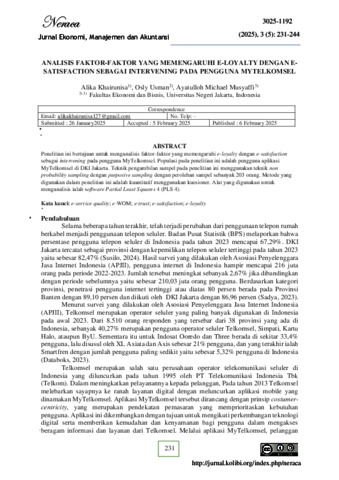 KHAIRUNISA, ALIKA (2025) ANALISIS FAKTOR-FAKTOR YANG MEMENGARUHI E-LOYALTY DENGAN E-SATISFACTION SEBAGAI INTERVENING PADA PENGGUNA MYTELKOMSEL. S1 thesis, Universitas Negeri Jakarta.