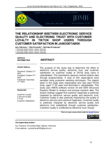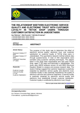 Ayu Febriana, 1707620010, Pengaruh kualitas layanan elektronik dan kepercayaan elektronik terhadap loyalitas pelanggan pada pengguna TikTok Shop di Jabodetabek dengan kepuasan pelanggan sebagai variabel mediasi Tujuan penelitian ini adalah untuk mengetahui pengaruh kualitas layanan elektronik, kepercayaan elektronik, dan kepuasan pelanggan terhadap loyalitas pelanggan pengguna TikTok shop di Jabodetabek. Metode penelitian kuantitatif ini mengumpulkan data melalui kuesioner. Sebanyak 250 responden diambil sampelnya dengan menggunakan teknik purposive sampling. Objek yang diambil dalam penelitian ini adalah responden yang pernah menggunakan TikTok shop, berusia 17-30 tahun dan berdomisili di Jabodetabek. Penelitian ini menggunakan perangkat lunak AMOS versi 24 dan SEM (Structural Equation Model) untuk menganalisis dan mengolah data penelitian. Temuan penelitian ini menunjukkan bahwa kepuasan pelanggan dipengaruhi secara positif oleh kualitas layanan elektronik dan kepercayaan elektronik. Loyalitas pelanggan juga dipengaruhi secara positif oleh kualitas layanan elektronik dan kepuasan pelanggan. Loyalitas pelanggan dipengaruhi secara positif oleh kualitas layanan elektronik dan kepercayaan elektronik yang terbentuk melalui kepuasan pelanggan. Namun, loyalitas pelanggan tidak dipengaruhi oleh kepercayaan elektronik. Temuan ini memberikan wawasan mendalam tentang bagaimana kepercayaan dan kualitas layanan yang unggul dapat menjadi fondasi kuat dalam membangun serta mempertahankan loyalitas pelanggan dalam strategi pemasaran. Kata kunci: Customer Loyalty, E-Service Quality, E-Trust, Customer Satisfaction