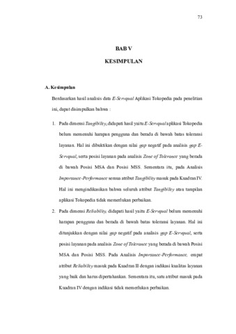 Crystal Anjanette Niman, 2024; “Analisis E-Servqual pada Aplikasi Tokopedia (Studi Kasus pada Generasi Z di DKI Jakarta)”. Skripsi, DKI Jakarta: Program Studi Pemasaran Digital, Fakultas Ekonomi, Universitas Negeri Jakarta. Tim Pembimbing: Dra. Sholikhah, M.M dan ewi Agustin Pratama Sari, S.E., M.S.M. E-Servqual atau Electronic Service Quality merupakan bagian yang penting pada sebuah e-commerce yang berhubungan dengan bagaimana penilaian pengguna pada layanan yang ada. Penelitian ini bertujuan untuk mengetahui E-Servqual pada Aplikasi Tokopedia menurut Generasi Z di DKI Jakarta. Penelitian ini menggunakan lima dimensi yaitu Tangibility, Reliability, Responsiveness, Assurance, dan Empathy. Pengumpulan data dilakukan dengan metode kuesioner yang dibagikan secara daring. Populasi pada penelitian ini yaitu pengguna aplikasi Tokopedia yang termasuk dalam kategori Generasi Z di DKI Jakarta. Diperoleh sampel sebanyak 130 responden sesuai kriteria penelitian. Uji Instrumen dilakukan menggunakan software SPSS versi 27 untuk uji validitas dan reliabilitas. Data di olah dengan teknik Analisis Deskriptif, Zone of Tolerance, dan E-Servqual. Hasil dari penelitian ini yaitu E-Servqual Aplikasi Tokopedia belum memenuhi harapan Generasi Z di DKI Jakarta. Berdasarkan analisis Zone of Tolerance didapati bahwa E-Servqual pada seluruh atribut sudah tidak dapat di toleransi lagi oleh pengguna. Berdasarkan analisis Gap E-Servqual, seluruh atribut memiliki gap minus dengan dimensi Empathy, Responsiveness, dan Assurance menempati rata-rata gap tertinggi secara berurutan dan perlu segera dilakukan perbaikan. Kata Kunci: E-Servqual, Aplikasi Tokopedia, E-Commerce, Generasi Z, Zone of Tolerance, Tangibility, Reliability, Responsiveness, Assurance, Empathy