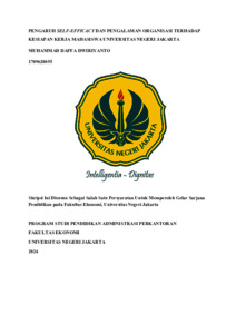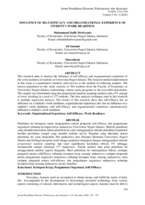 Muhammad Daffa Dwiriyanto. 1709620055. Pengaruh Self-Efficacy Dan Pengalaman Organisasi Terhadap Kesiapan Kerja Mahasiswa Universitas Negeri Jakarta. Penelitian ini bertujuan untuk menganalisis terkait pengaruh self-efficacy dan pengalaman organisasi terhadap kesiapan kerja mahasiswa Universitas Negeri Jakarta. Metode penelitian yang diimplementasikan dalam penelitian ini yaitu menggunakan metode penelitian kuantitatif melalui perolehan sampel yang diambil melalui survei. Populasi yang diketahui dalam penelitian ini yaitu berjumlah 364 mahasiswa dari Fakultas Ekonomi Universitas Negeri Jakarta. Populasi terjangkau dalam penelitian ini yaitu mencakup seluruh mahasiswa yang mengikuti organisasi dari berbagai program studi dalam Fakultas Ekonomi dari Universitas Negeri Jakarta. Metode pengambilan sampel dalam penelitian ini yaitu menggunakan metode propotional random sampling, taraf signifikasi kesalahan yaitu sebesar 5% yang menghasilkan sampel penelitian sebanyak 177 mahasiswa. Teknik analisis data pada penelitian ini menggunakan analisisregresi berganda. Hasil penelitian ini menunjukkan bahwa, terdapat pengaruh antara selfefficacy terhadap kesiapan kerja seorang mahasiswa, terdapat pengaruh antara pengalaman organisasi mahasiswa terhadap kesiapan kerja seorang mahasiswa, serta terdapat pengaruh antara self-efficacy dan pengalaman organisasi mahasiswa terhadap kesiapan kerja seorang mahasiswa secara simultan. Dengan hasil uji t hitung variabel self-efficacy (X1) menunjukkan angka 4,278 > 1,97, hasil uji t hitung variabel pengalaman organisasi (X2) menunjukkan angka 7,687 > 1,97, dan hasil uji F hitung variabel self-efficacy (X1) dan pengalaman organisasi (X2) menunjukkan angka 87,405 > 3,05. Kata Kunci : Kesiapan Kerja, Pengalaman Organisasi, Self-Efficacy.