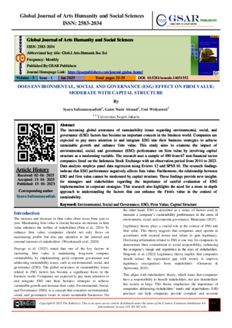 SALIMATUSYADIAH, SYARA (2025) PENGARUH KINERJA ENVIRONMENTAL, SOCIAL AND GOVERNANCE (ESG) TERHADAP NILAI PERUSAHAAN DENGAN STRUKTUR MODAL SEBAGAI VARIABEL MODERASI. S2 thesis, Universitas Negeri Jakarta.