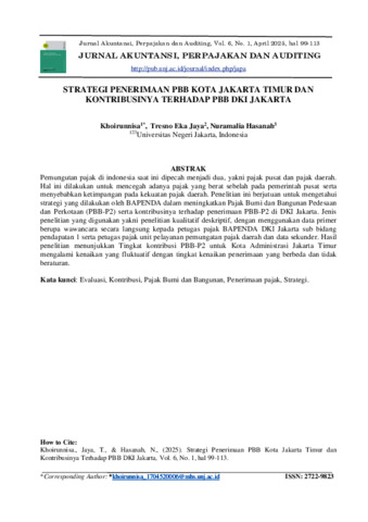 KHOIRUNNISA, KHOIRUNNISA (2025) STRATEGI PENERIMAAN PAJAK BUMI DAN BANGUNAN (PBB) KOTA ADMINISTRASI JAKARTA TIMUR DAN KONTRIBUSINYA TERHADAP PENERIMAAN PBB DI DKI JAKARTA. S1 thesis, Universitas Negeri Jakarta.
