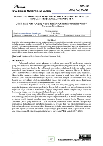 PUTRI, JESSICA TANIA (2025) PENGARUH LINGKUNGAN KERJA DAN BUDAYA ORGANISASI TERHADAP KEPUASAN KERJA KARYAWAN PADA PT X. S1 thesis, Universitas Negeri Jakarta.