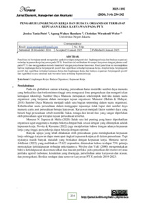 Tujuan penelitian ini adalah: 1) Untuk menganalisis dan mengetahui pengaruh antara lingkungan kerja terhadap kepuasan kerja karyawan pada PT “X”. 2) Untuk menganalisis dan mengetahui pengaruh antara budaya organisasi terhadap kepuasan kerja karyawan pada PT “X”. 3) Untuk menganalisis dan mengetahui pengaruh lingkungan kerja dan budaya organisasi terhadap kepuasan kerja karyawan di PT “X”. Penelitian ini dilakukan kepada 46 orang karyawan PT “X”. Teknik pengumpulan data menggunakan metode survei melalui penyebaran kuesioner dan diolah menggunakan SPSS (Statistic Product and Service Solutions) versi 27 sebagai perangkat lunak dalam pengolahan dan analisis. Penelitian ini menggunakan analisis deskriptif. Hasil yang didapat dari analisis regresi menunjukkan terdapat pengaruh positif dan signifikan antara lingkungan kerja dan budaya organisasi terhadap kepuasan kerja karyawan. Model lingkungan kerja dan budaya organisasi berpengaruh signifikan secara simultan terhadap kepuasan kerja pada karyawan PT “X” dengan nilai Fhitung > Ftabel 31,845 > 3,21 dan nilai signifikansi yang didapat lebih kecil dari 0,05 yaitu 0,001 < 0,05. Kata kunci: Lingkungan Kerja, Budaya Organisasi, Kepuasan Kerja.