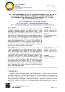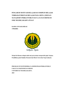RAHMA DWI KHAMIDAH, 1709620082. “Pengaruh Motivasi Belajar dan Disiplin Belajar terhadap Prestasi Belajar pada Siswa Jurusan Manajemen Perkantoran dan Layanan Bisnis di SMK Negeri Jakarta Pusat”. Skripsi. Program Studi Pendidikan Administrasi Perkantoran, Fakultas Ekonomi dan Bisnis, Universitas Negeri Jakarta, 2025. Penelitian ini bertujuan untuk menganalisis sejauh mana motivasi belajar dan disiplin belajar berkontribusi terhadap prestasi belajar pada siswa. Metode yang digunakan adalah pendekatan kuantitatif. Populasi yang digunakan sebanyak 144 siswa di SMK Negeri Jakarta Pusat, dengan jumlah sampel yang menggunakan sampel jenuh yaitu sebanyak 144 siswa. Pengumpulan data menggunakan penyebaran kuesioner dengan skala likert. Pengelolaan dan menganalisis data menggunakan bantuan aplikasi program SPSS 26 dengan menggunakan uji validitas, uji reliabilitas, uji asumsi klasik, analisis regresi linear berganda, Uji T, Uji F, dan uji koefisien determinasi. Berdasarkan hasil pada penelitian ini dapat disimpulkan bahwa motivasi belajar (X1) berpengaruh positif dan signifikan terhadap prestasi belajar (Y) siswa karena nilai signifikansi 0,000 < 0,05. Kemudian disiplin belajar (X2) berpengaruh positif dan signifikan terhadap prestasi belajar (Y) siswa karena memiliki nilai signifikansi 0,000 < 0,05. Kemudian secara simultan motivasi belajar (X1) dan disiplin belajar (X2) berpengaruh signifikan terhadap prestasi belajar (Y) siswa karena memiliki nilai signifikansi 0,000 < 0,05. Dari hasil analisis, diperoleh nilai R2 sebesar 0,575 atau prestasi belajar dapat dipengaruhi sebesar 57,5% oleh variabel motivasi belajar dan disiplin belajar. Kata Kunci : Motivasi Belajar, Disiplin Belajar, Prestasi Belajar.