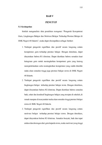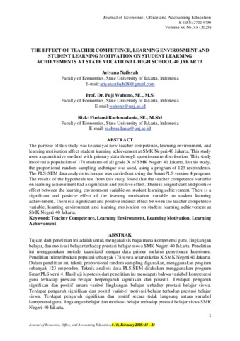 Ariyana Nafisyah, 1709620016, Pengaruh Kompetensi Guru, Lingkungan Belajar dan Motivasi Belajar Terhadap Prestasi di SMK Negeri 40 Jakarta Penelitian ini bertujuan untuk mengetahui Pengaruh Kompetensi Guru, Lingkungan Belajar dan Motivasi Belajar Terhadap Prestasi di SMK Negeri 40 Jakarta. Metode yang digunakan adalah metode survey dengan metode pendekatan kuantitatif. Populasi pada penelitian ini sejumlah 178 siswa jelas X SMK Negeri 40 Jakarta. Teknik dalam penentuan sampel pada penelitian ini menggunakan teknik stratified random sampling menggunakan tabel Issac dan Michael dengan tingkat kesalahan 5% sehingga sampel dalam penelitian ini berjumlah 123 siswa. Model yang digunakan dalam penelitian ini adalah hubungan dan pengaruh atau analisis jalur (path analysis). Untuk menguji hipotesis, teknik analisis kecocokan model yang digunakan adalah Structural Equation Modeling Partial Least Square (SEM-PLS) dengan perangkat lunak SmartPLS Versi 4.0. Hasil perhitungan dari penelitian ini menjelaskan bahwa kompetensi guru berpengaruh signifikan dan positif secara langsung terhadap prestasi belajar, lingku belajar berpengaruh signifikan dan positif secara langsung terhadap prestasi belajar, motivasi belajar berpengaruh signifikan dan positif secara langsung terhadap prestasi belajar, kompetensi guru, lingkungan belajar dan motivasi belajar berpengaruh signifikan dan positif secara langsung terhadap prestasi belajar. Kata Kunci: Kompetensi Guru, Lingkungan Belajarr, Motivasi Belajar dan Motivasi Belajar, Prestasi Belajar