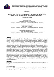 KHATAMA AULIA. Pengaruh Angka Harapan Hidup, Pengangguran, DAN Pendidikan Terhadap Kemiskinan Di Provinsi D.I. Yogyakarta. Skripsi. Jakarta. Program Studi Pendidikan Ekonomi. Fakultas Ekonomi dan Bisnis. Universitas Negeri Jakarta. 2025. Tujuan dari penelitian ini adalah untuk mengkaji bagaimana tingkat kemiskinan di Daerah Administratif Khusus Yogyakarta (DIY) dipengaruhi oleh Angka Harapan Hidup, Angka Pengangguran, dan Rata-rata Penyelesaian Pendidikan. Selain pendapatan yang rendah, kemiskinan merupakan masalah sosial yang kompleks dan kompleks yang mempengaruhi kualitas hidup, akses terhadap pendidikan, dan prospek pekerjaan. Untuk mengetahui sejauh mana faktor-faktor independen (AHH, pengangguran, dan RPP) mempengaruhi variabel dependen, yaitu tingkat kemiskinan, penelitian ini menggunakan metodologi kuantitatif dengan menggunakan analisis regresi linier berganda. Badan Pusat Statistik (BPS) Daerah Istimewa Yogyakarta menyediakan data sekunder berupa data panel untuk tahun 2012–2023, yang mencakup empat kabupaten dan satu kota (Bantul, Gunungkidul, Kulonprogo, Sleman, dan Yogyakarta) di Daerah Istimewa Yogyakarta. Perangkat lunak Eviews versi 12 digunakan untuk menilai model regresi berganda dengan efek tetap yang digunakan dalam penelitian ini. Menurut temuan analisis, kemiskinan dipengaruhi secara signifikan oleh AHH dan RLS, sehingga peningkatan standar layanan kesehatan dan pendidikan kemungkinan akan menurunkan angka kemiskinan. Kemiskinan juga dipengaruhi secara positif oleh variabel pengangguran, yang menunjukkan bahwa peningkatan pengangguran cenderung meningkatkan jumlah orang miskin. Untuk mengentaskan kemiskinan secara berkelanjutan, studi ini menyoroti pentingnya kebijakan publik dalam meningkatkan kualitas dan aksesibilitas layanan kesehatan dan pendidikan sekaligus menciptakan lapangan kerja yang menguntungkan di sektor kewirausahaan. Dengan mempertimbangkan semua hal, studi ini menambah kumpulan penelitian empiris yang berkembang tentang variabel sosial ekonomi yang memengaruhi kemiskinan di tingkat regional dan dapat menjadi dasar bagi inisiatif pembangunan yang lebih terarah oleh pemerintah daerah. Kata kunci: Kemiskinan, Angka Harapan Hidup, Pengangguran, Rata-rata Lama Sekolah, Daerah Istimewa Yogyakarta