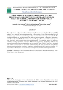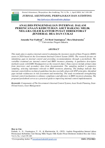 AMANDA NUR FADIRAH. Analisis Pengendalian Internal Dalam Perencanaan Kebutuhan Aset Barang Milik Negara oleh Kantor Pusat Direktorat Jenderal Bea dan Cukai. Skripsi, Fakultas Ekonomi dan Bisnis, Universitas Negeri Jakarta, 2025. Penelitian ini bertujuan untuk menganalisis penerapan sistem pengendalian internal dalam proses perencanaan kebutuhan aset inventaris Barang Milik Negara (BMN) tahun 2024 berdasarkan lima komponen Standar Pengendalian Intern Pemerintah (SPIP) serta 25 prinsip didalamnya. Pendekatan yang digunakan bersifat kualitatif dengan metode analisis deskriptif. Jenis penelitian yang diterapkan dalam penelitian ini adalah studi kasus. Objek penelitian adalah Kantor Pusat Direktorat Jenderal Bea dan Cukai (DJBC), dengan data yang diperoleh dari sumber primer dan sekunder. Data primer dikumpulkan melalui wawancara dengan pihak terkait, sedangkan data sekunder berasal dari dokumentasi yang berkaitan dengan perencanaan kebutuhan aset inventaris BMN. Dalam analisis data, penelitian ini menerapkan tiga tahapan utama, yaitu reduksi data, penyajian data, serta penarikan dan verifikasi kesimpulan. Hasil penelitian yang didapatkan dari hasil wawancara dan dokumentasi menunjukkan bahwa penerapan pengendalian internal dalam perencanaan kebutuhan aset inventaris BMN telah berpedoman pada regulasi yang berlaku. Namun, dalam implementasinya masih terdapat beberapa aspek yang belum sepenuhnya selaras dengan prinsip SPIP, sehingga dapat menimbulkan potensi kelemahan dalam pengelolaan aset BMN, seperti ketidaksesuaian dalam perencanaan dan pengawasan yang kurang optimal. Sebagai solusi atas permasalahan tersebut, penelitian ini merekomendasikan penyusunan buku saku yang berisi evaluasi tindakan perbaikan yang diperlukan dalam perencanaan kebutuhan aset BMN seperti saran pembuatan kerangka konseptual dalam buku saku terdiri dari langkah-langkah pengendalian internal dalam perencanaan aset kebutuhan BMN atau Standard Operational Prosedur (SOP) dalam bentuk flowchart. Buku saku ini diharapkan dapat menjadi acuan bagi pihak terkait dalam mengatasi celah pengendalian internal serta meningkatkan efektivitas pengelolaan aset secara lebih sistematis, akuntabel, dan transparan. Kata Kunci: Komponen Sistem Pengendalian Intern Pemerintah, Perencanaan Kebutuhan Aset, Barang Milik Negara, Pengelolaan Aset, Efektivitas Pengendalian