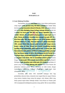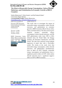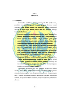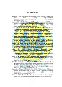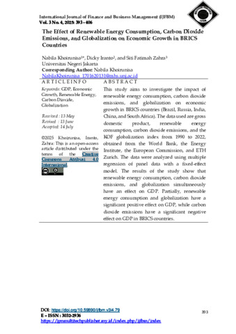 i ABSTRAK Nabila Khoirunisa: Pengaruh Konsumsi Energi Terbarukan, Emisi Karbon Dioksida, dan Globalisasi terhadap Pertumbuhan Ekonomi di Negara-Negara BRICS, Jakarta: Program Studi Pendidikan Ekonomi, Fakultas Ekonomi dan Bisnis, Universitas Negeri Jakarta, 2025. Studi ini dilatarbelakangi oleh meningkatnya perhatian global terhadap isu-isu lingkungan dan keberlanjutan ekonomi, serta peran signifikan negara-negara BRICS dalam dinamika ekonomi dunia. Penelitian ini bertujuan untuk menganalisis pengaruh konsumsi energi terbarukan, emisi karbon dioksida, dan globalisasi terhadap pertumbuhan ekonomi di negara-negara BRICS (Brasil, Rusia, India, Tiongkok, dan Afrika Selatan) selama periode 1990 hingga 2022 dengan menggunakan metode regresi data panel pendekatan Fixed Effect Model (FEM). Data yang digunakan adalah data cross-section dan sekunder yang diperoleh dari World Bank, Energy Institute, European Commission, dan ETH Zurich. Kemudian, hasil penelitian menunjukkan bahwa konsumsi energi terbarukan berpengaruh positif signifikan terhadap pertumbuhan ekonomi, sedangkan emisi karbon dioksida berpengaruh negatif signifikan, dan globalisasi memiliki pengaruh positif signifikan terhadap pertumbuhan ekonomi di negara-negara BRICS. Temuan ini mengindikasikan pentingnya transisi energi bersih dan pengendalian emisi karbon untuk mendorong pertumbuhan ekonomi yang berkelanjutan khususnya di lima negara BRICS. Oleh karena itu, kebijakan yang mendukung investasi energi terbarukan dan peningkatan integrasi global perlu diperkuat sebagai strategi pembangunan jangka panjang di kawasan BRICS. Kata Kunci: GDP, Pertumbuhan Ekonomi, Konsumsi Energi Terbarukan, Emisi Karbon Dioksida, Globalisasi, BRICS