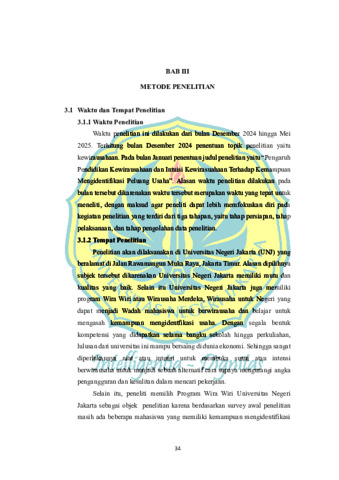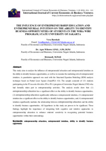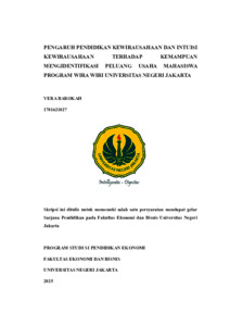 VERA BAROKAH. Pengaruh Pendidikan Kewirausahaan Dan Intuisi Kewirausahaan Terhadap Kemampuan Mengidentifikasi Peluang Usaha Mahasiswa Program Wira Wiri Universitas Negeri Jakarta. Skripsi. Jakarta. Program Studi Pendidikan Ekonomi. Fakultas Ekonomi dan Bisnis. Universitas Negeri Jakarta Penelitian ini bertujuan untuk menganalisis pengaruh pendidikan kewirausahaan dan intuisi kewirausahaan terhadap kemampuan mengidentifikasi peluang usaha, serta menguji peran intuisi kewirausahaan sebagai variabel mediasi. Penelitian ini menggunakan pendekatan kuantitatif dengan teknik analisis Structural Equation Modeling (SEM) berbasis Partial Least Square (SmartPLS 4.0). Sampel dalam penelitian ini berjumlah 131 mahasiswa peserta program Wirausaha Merdeka (Wira-Wiri) di Universitas Negeri Jakarta (UNJ) yang telah mengikuti kegiatan kewirausahaan secara formal. Hasil analisis menunjukkan bahwa: (1) pendidikan kewirausahaan berpengaruh signifikan terhadap kemampuan mengidentifikasi peluang usaha, (2) pendidikan kewirausahaan berpengaruh signifikan terhadap intuisi kewirausahaan, (3) intuisi kewirausahaan berpengaruh signifikan terhadap kemampuan mengidentifikasi peluang usaha, (4) intuisi kewirausahaan memediasi secara signifikan hubungan antara pendidikan kewirausahaan dan kemampuan mengidentifikasi peluang usaha. Seluruh hipotesis dalam penelitian ini terbukti signifikan. Temuan ini mengindikasikan pentingnya integrasi antara pendekatan kognitif dan intuitif dalam pembelajaran kewirausahaan, guna meningkatkan kepekaan mahasiswa terhadap peluang bisnis yang ada di lingkungan sekitarnya. Kata kunci: pendidikan kewirausahaan, intuisi kewirausahaan, kemampuan mengidentifikasi peluang usaha.