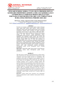 i ABSTRAK Penelitian ini bertujuan untuk menguji apakah terdapat hubungan antara modal kerja, utang, biaya promosi, dewan komisaris independen, komite audit, dan keberagaman gender dewan terhadap profitabilitas pada perusahaan sektor healthcare yang terdaftar di Bursa Efek Indonesia. Variabel bebas yang digunakan dalam penelitian ini adalah modal kerja, utang, biaya promosi, dewan komisaris independen, komite audit, dan keberagaman gender dewan. Variabel terikat yang digunakan adalah profitabilitas. Penelitian ini menggunakan data sekunder yaitu laporan keuangan perusahaan sektor healthcare yang terdaftar di Bursa Efek Indonesia periode 2020 – 2023 (116 observasi). Metode pengambilan sampel yang digunakan dalam penelitian ini metode purposive sampling. Metode yang digunakan dalam penelitian ini adalah analisis regresi linear berganda yang diolah menggunakan aplikasi SPSS versi 27. Hasil penelitian menunjukkan bahwa : (1) modal kerja berpengaruh negatif terhadap profitabilitas. (2) Utang berpengaruh negatif terhadap profitabilitas. (3) Biaya promosi berpengaruh negatif terhadap profitabilitas. (4) Dewan komisaris independen berpengaruh negatif terhadap profitabilitas. (5) Komite audit tidak berpengaruh terhadap profitabilitas. (6) Keberagaman gender dewan berpengaruh positif terhadap profitabilitas. Penelitian selanjutnya diharapkan dapat dapat menambah sampel perusahaan di luar sektor healthcare yang terdaftar di Bursa Efek Indonesia dan dan perusahaan yang tidak terdaftar di Bursa Efek Indonesia, menambahkan variabel-variabel lain yang dapat memberikan gambaran lebih menyeluruh tentang determinan profitabilitas perusahaan, dan menggunakan proksi yang lain untuk melakukan perhitungan variabel. Kata Kunci : modal kerja, utang, biaya promosi, dewan komisaris independen, komite audit, keberagaman gender dewan, profitabilitas